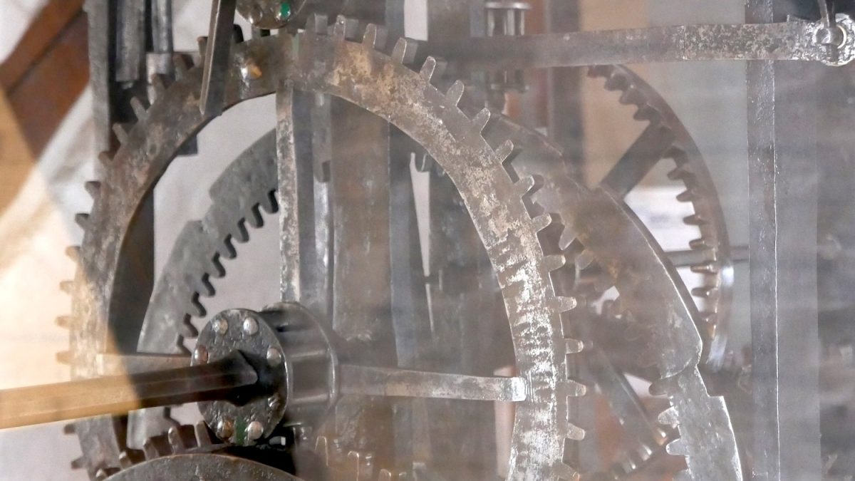 De klok van het Dinghuis is van rond 1390. De klok heeft maar een wijzer. Voor de uren, dat was in die tijd al zeer nauwkeurig. Wat zit er eigenlijk aan de achterkant?