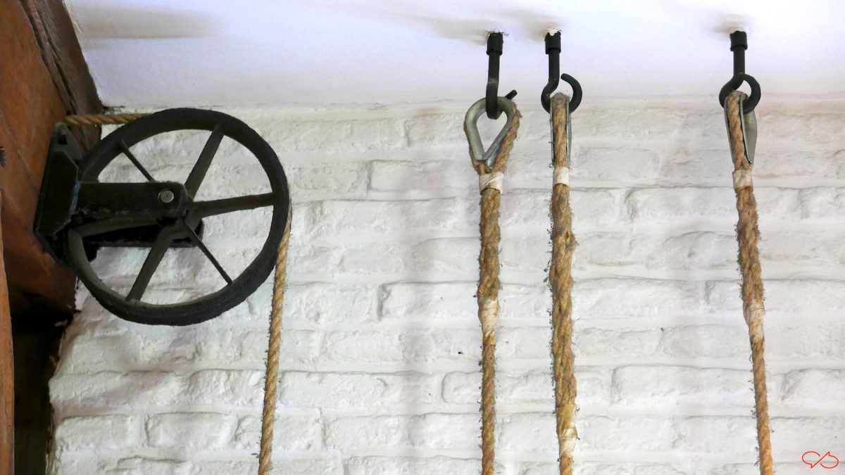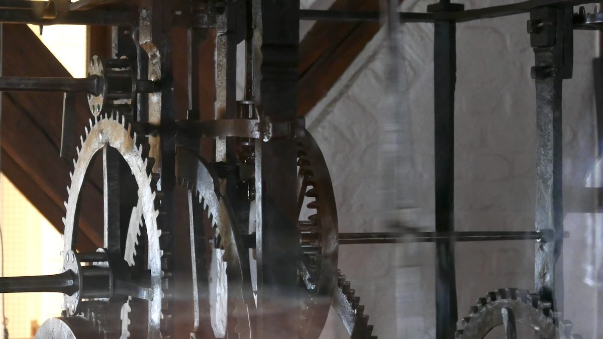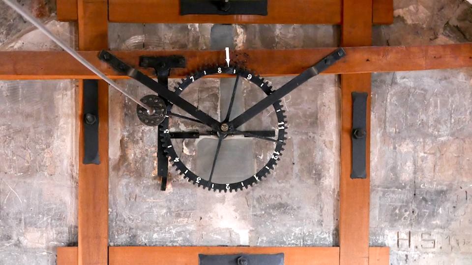 De beweging van de tandwielen gaat met touwen en gewichten. Die drijven de klok aan en ook de klok: het uurwerk en de bel. Dan gaat er één as (lichtgrijs) naar de muur. Daar wordt de draaiende beweging overgebracht op een groter tandwiel. Dat wiel heeft een uuraanduiding: zo kan men de klok van binnenuit op tijd zetten. Dat wiel draait trouwens tegen de klok in. Dan gaat de as door de muur en de wijzerplaat buiten. Op het moment van de foto was het kwart over acht ’s ochtends.