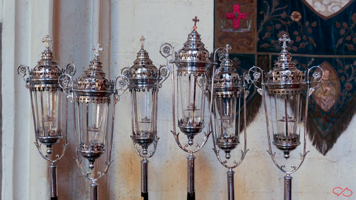 Kijk, zes flambouwen. Dit zijn olielampen aan een lange stok die meegedragen worden met processies. Men droeg ze naast het processiekruis. Toeschouwers hoorden te knielen tot de flambouwen voorbij waren. 19e eeuws zilverwerk.