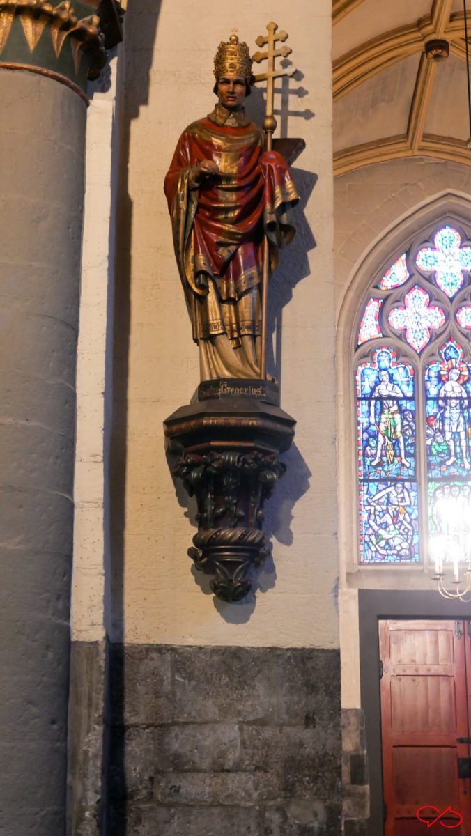 Er hangen verschillende beelden aan muren en pilaren. Een daarvan is van Sint-Gregorius de Grote, paus tussen 590 en 604. Zijn naam leeft voort in de gregoriaanse muziek. Het gaat dan niet om de muziekstijl, maar om regels waaraan religieuze muziek moest voldoen en de manier van noteren.