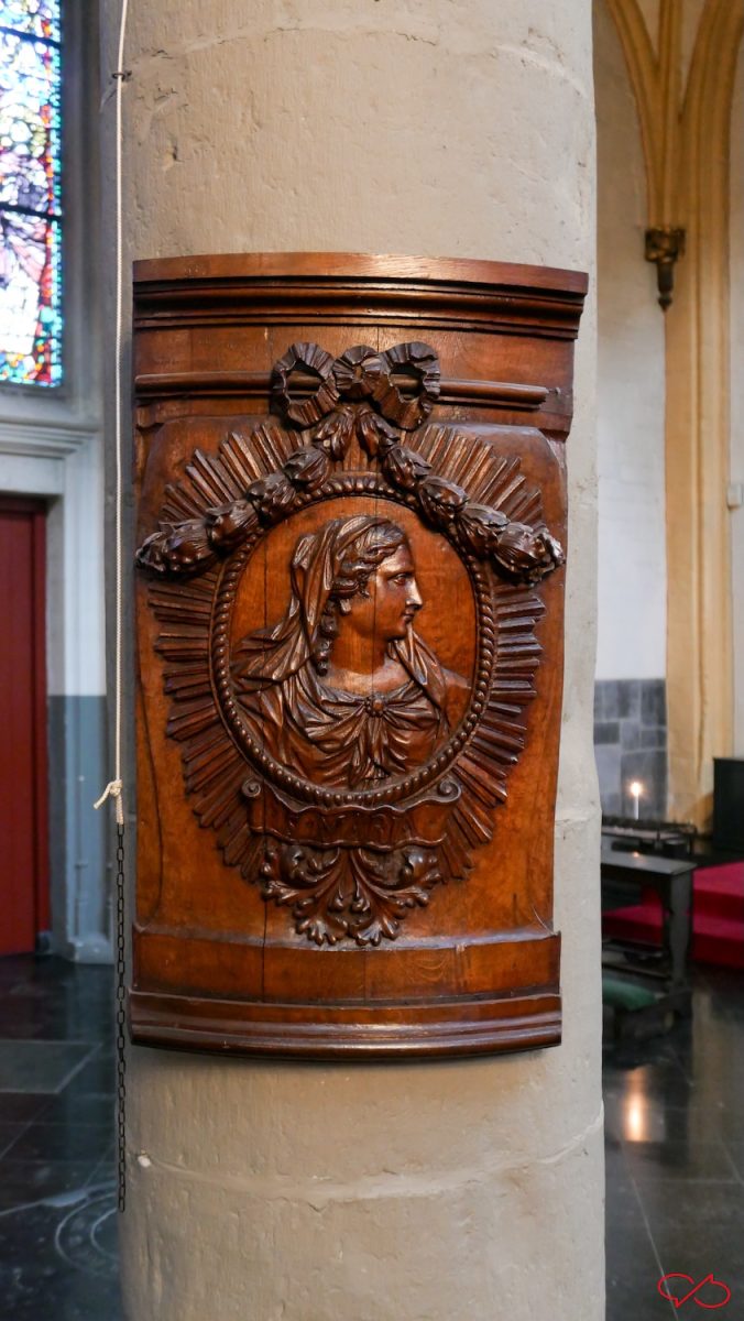 Aan twee pilaren hangen gebogen houten borden met snijwerk. Het zijn resten van een ronde preekstoel. Die heeft aan de linkerkant gestaan.