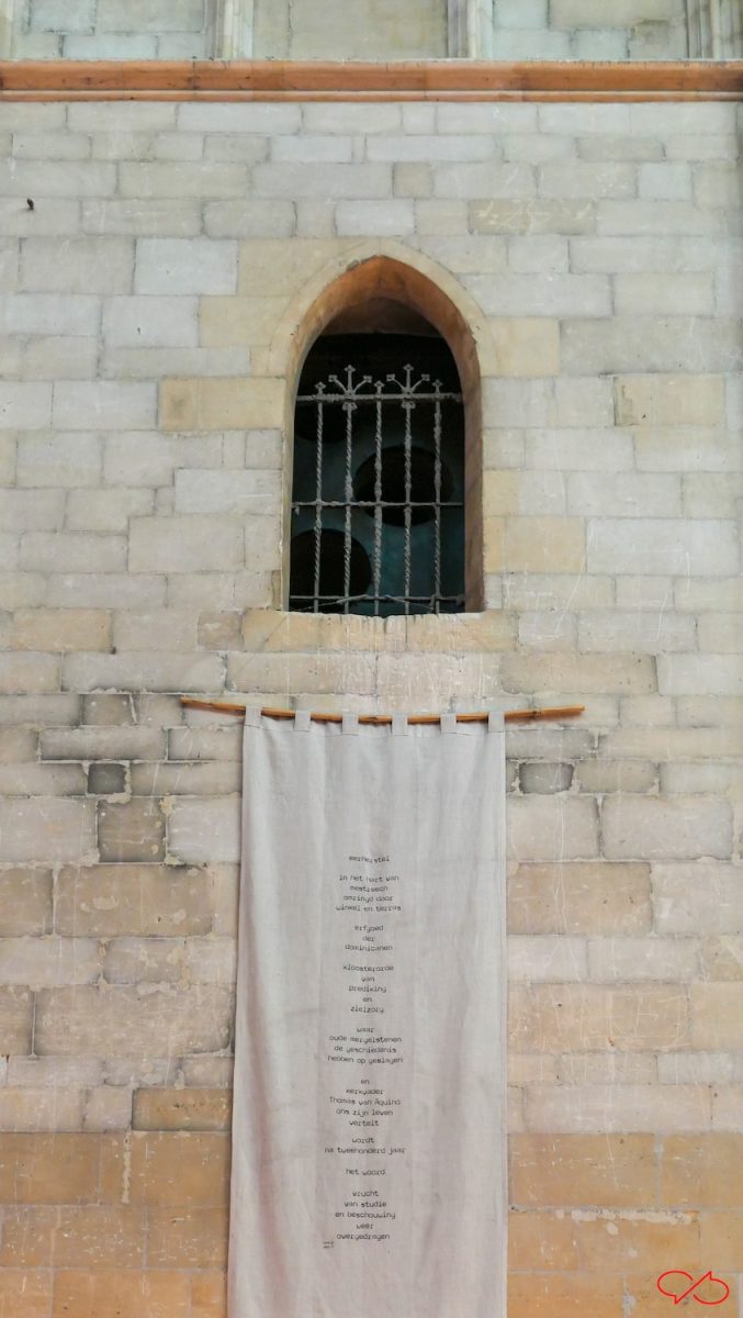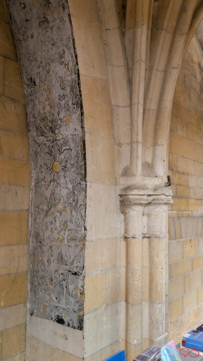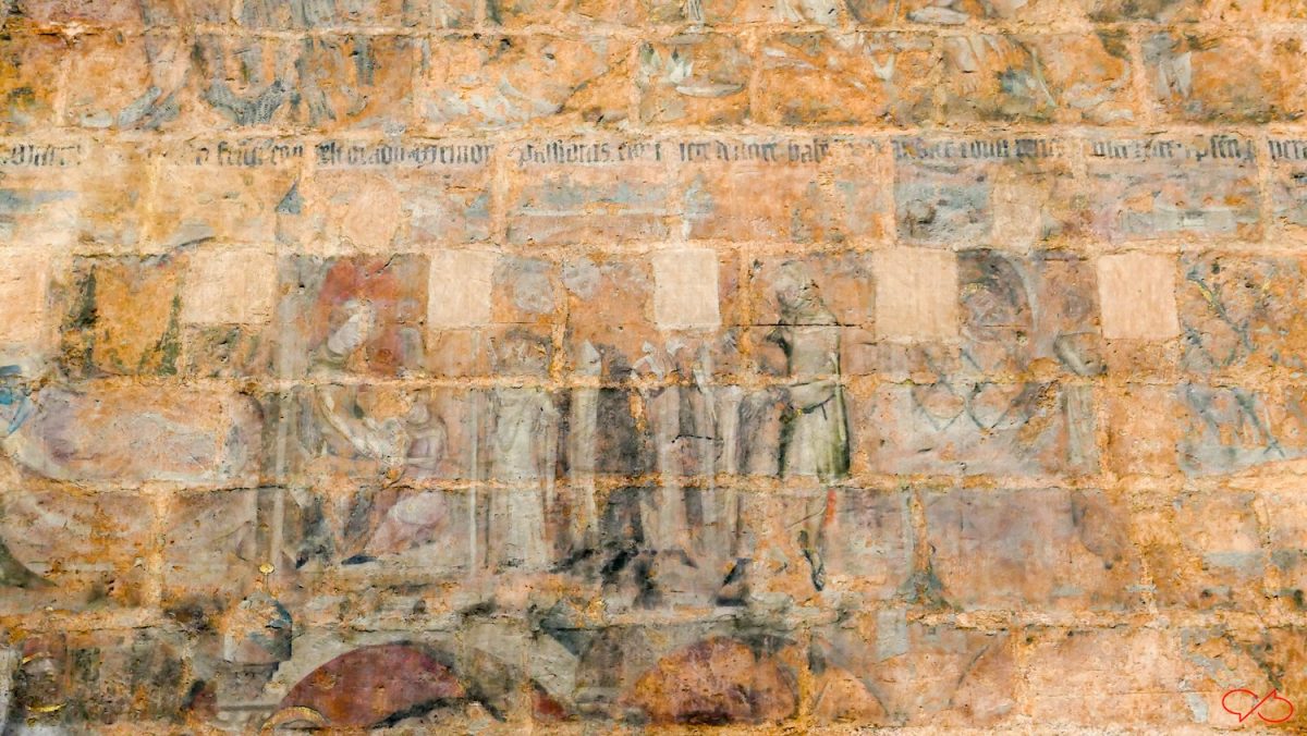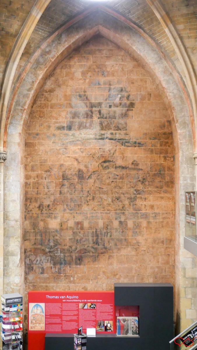 Als je binnenkomt, zie je links onder de tweede boog wandschilderingen. Ze zijn zo dun en onduidelijk dat je erg goed moet kijken. Onderaan is een display met uitleg. Daar is de schildering in het klein ook beter te zien. Het zijn scenes uit het leven van Thomas van Aquino, geschilderd ergens in de middeleeuwen. De schilderingen werden in 1866 herontdekt. De rode rechthoek verwijst naar de detailfoto. Die laat zien dat er tekst staat in de tekening. Wie de tekening in detail wil zien, doet er goed aan het display met uitleg te gaan bekijken.