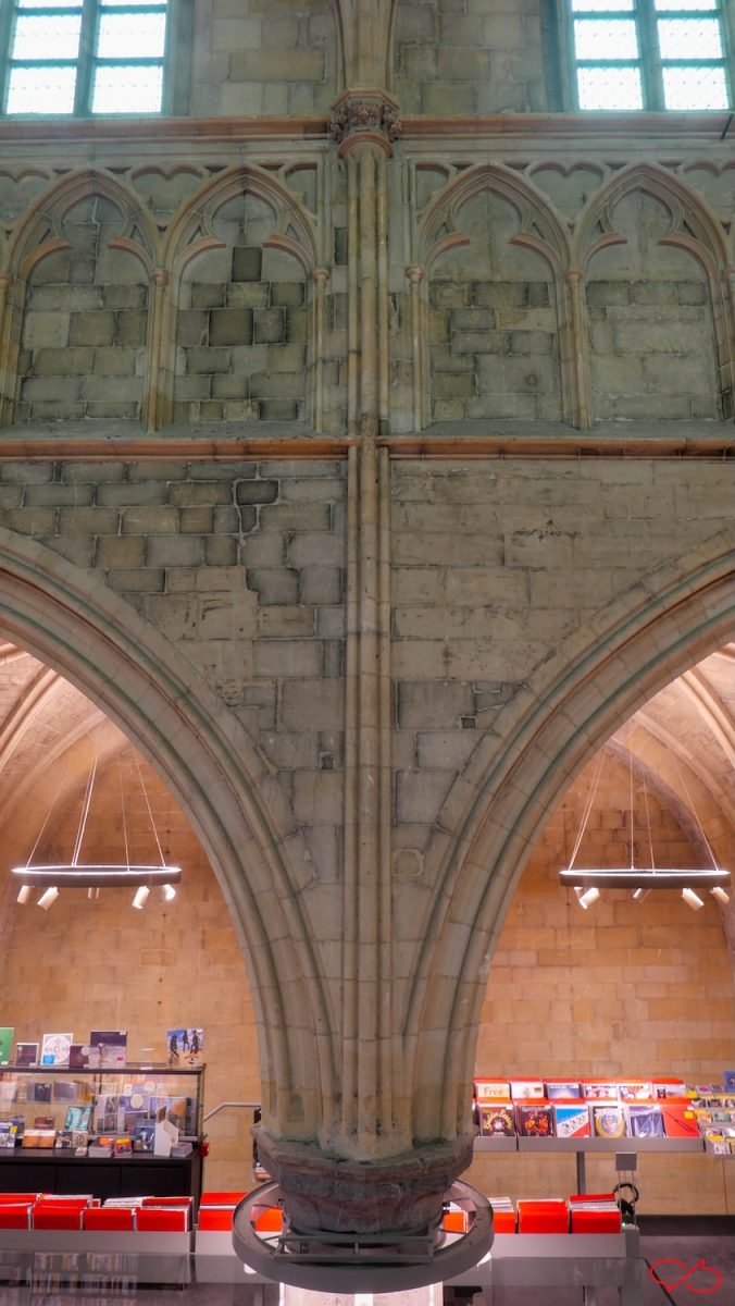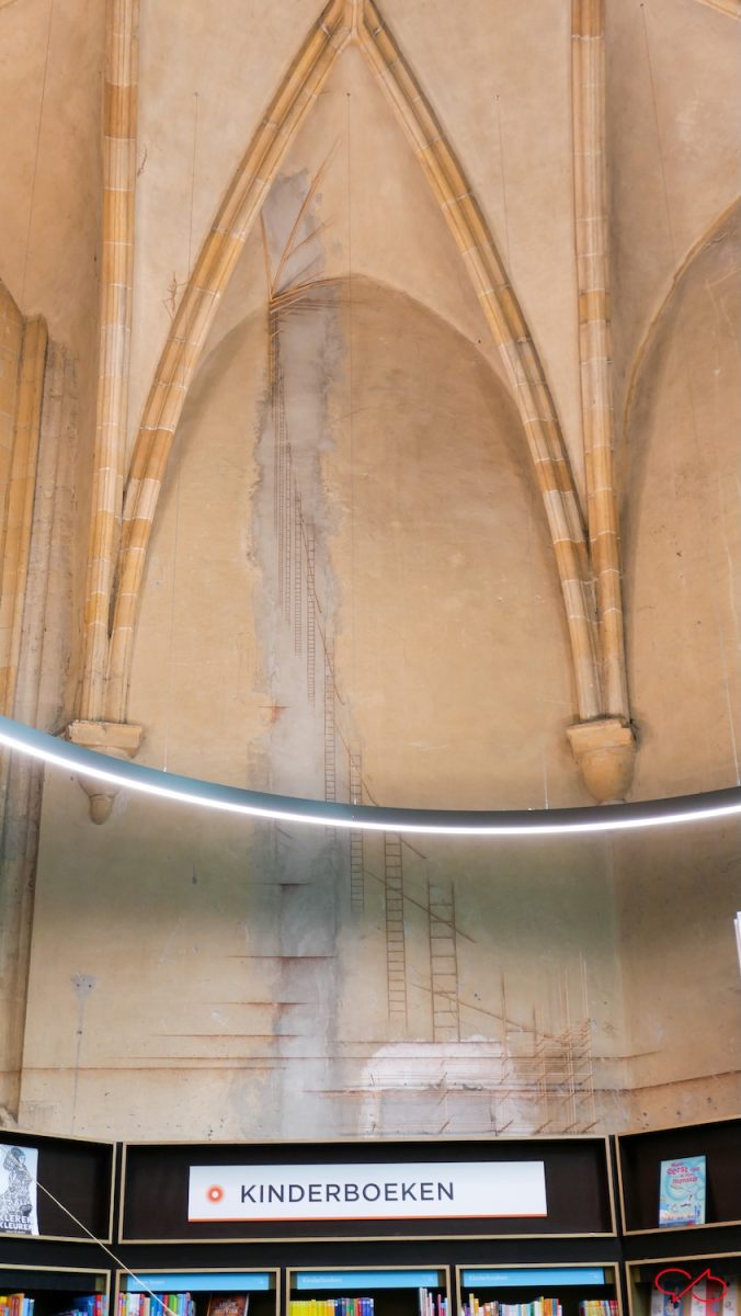 Twee zaken vragen daar aandacht: de afdeling kinderboeken en het kunstwerk van Paul Tieman. Dat heet Les échelles des êtres humains. De titel laat zich moeilijk vertalen in het Nederlands, maar het lijkt het meest op De laddertjes van het menselijk bestaan. Het werk bestaat uit drie delen: de houten structuur onderaan die lijkt op steigers, de tekening met de ladders en daarboven de houten balken die het gewelf ondersteunen. Wie een verrekijker meeneemt, ziet dat er ook nog levende wezens meedoen.