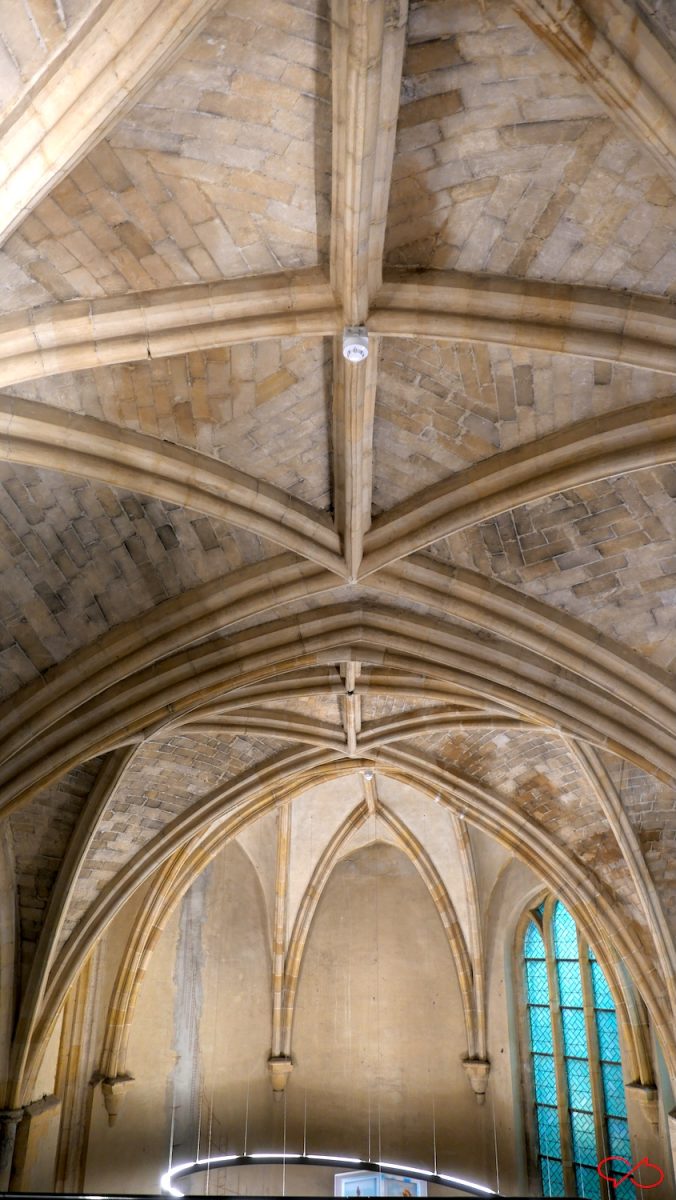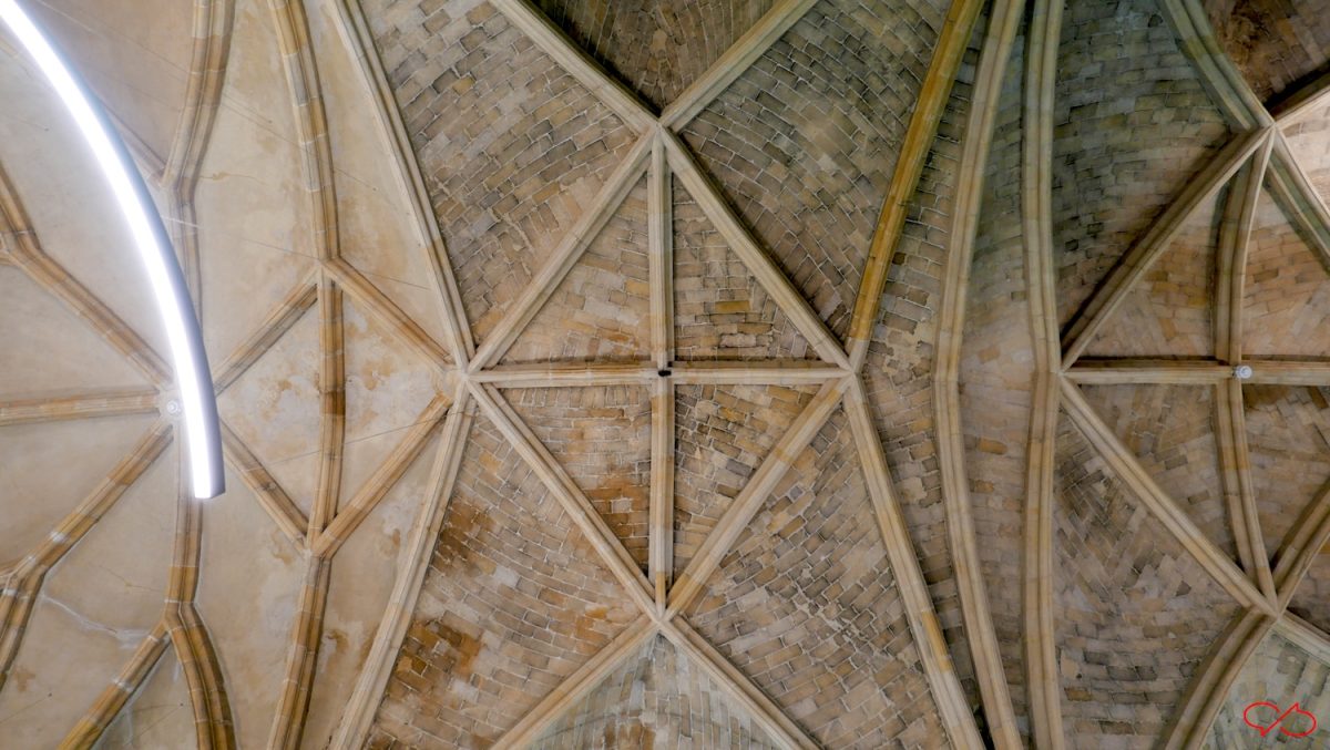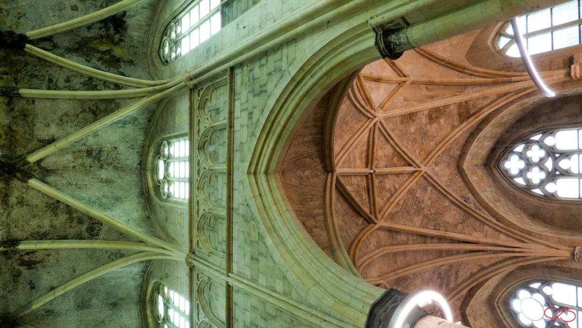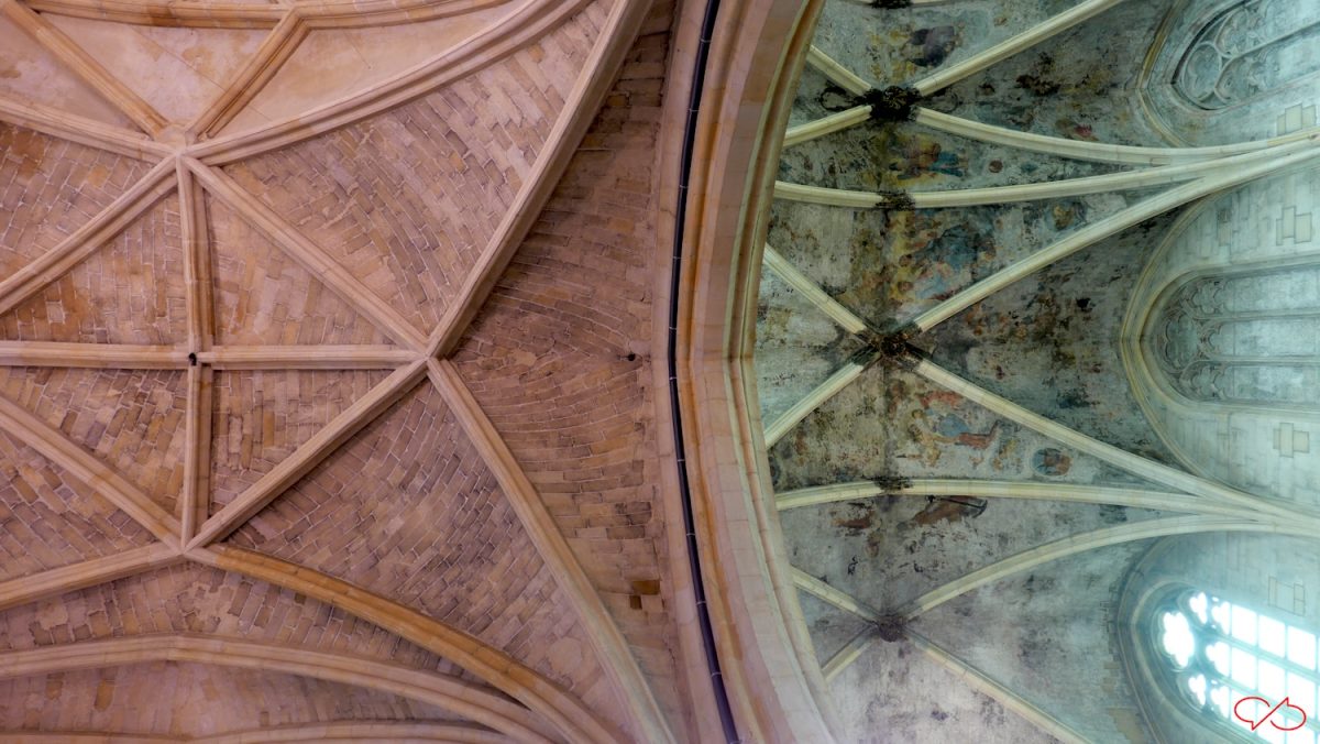 De kruisribben ontstaan als men vier pilaren met elkaar verbindt met ribben. Vier verbindingen langs de rand van het vierkant en twee diagonaal. Die ribben zijn ook nog boogvormig, dat vormt een sterke constructie. Om de constructie nog sterker te maken, kunnen nog extra verbindingen gemaakt worden. Dan ontstaan er bijvoorbeeld stergewelven. Die zien we hier in de Onze-Lieve-Vrouwekapel. Door de ribben op te vullen met bakstenen, hout of stucwerk, ontstaan er plafonds. Hier zijn de ribben gevuld met gemetselde bakstenen.