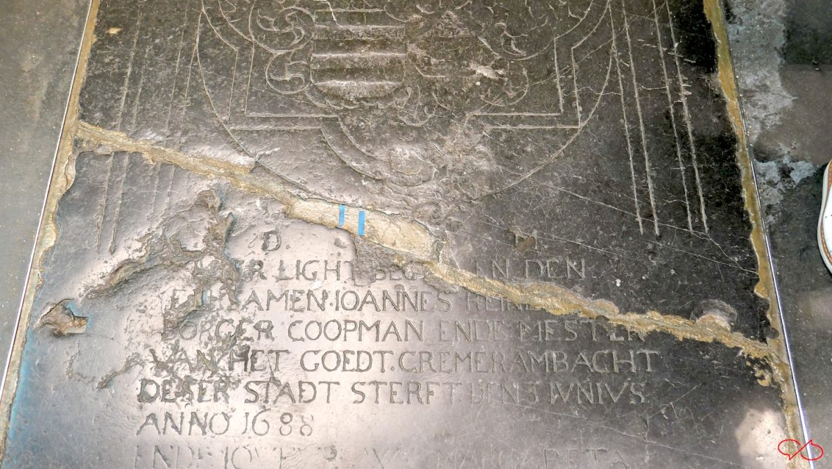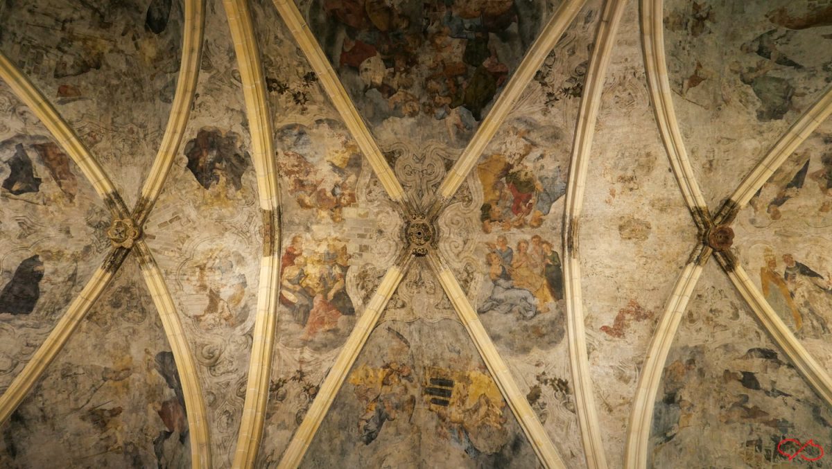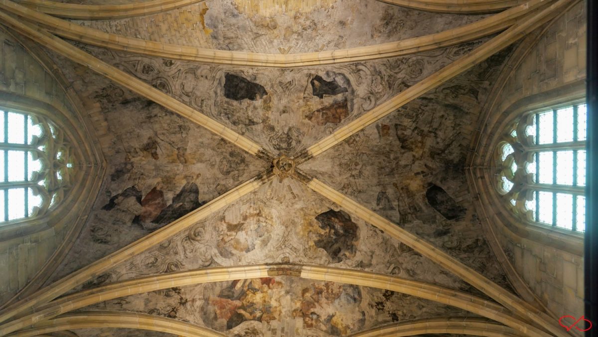 En dan zijn er de plafondschilderingen. Die zijn ook erg onduidelijk. Rond 1618 gemaakt door Jan Vasoens (ook wel Vassens), een monnik uit de Dominicaner orde. Het werk is in olieverf. Op de foto zien we rechts van het midden vijf engelen die muziek maken. En er zijn geschilderde aftakkingen van de bogen. Op veel plaatsen schijnen de bakstenen er doorheen. Het laat zien hoe dun de schilderingen zijn. Wat zal het prachtig geweest zijn toen, toen het nog leek op de Sixtijnse Kapel 🙂