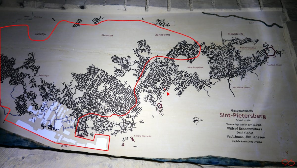 We zien eerst een foto van de kaart van de gangenstelsels in de Sint-Pietersberg. Die kaart is getekend op een muur in de gangen en is sinds kort helemaal klaar. Er staat een rood driehoekje op dat wijst naar een rood streepje: in die gang is deze kaart. Verder ziet u een rode lijn. Dat is het gebied dat de ENCI in de loop van een eeuw heeft afgegraven.