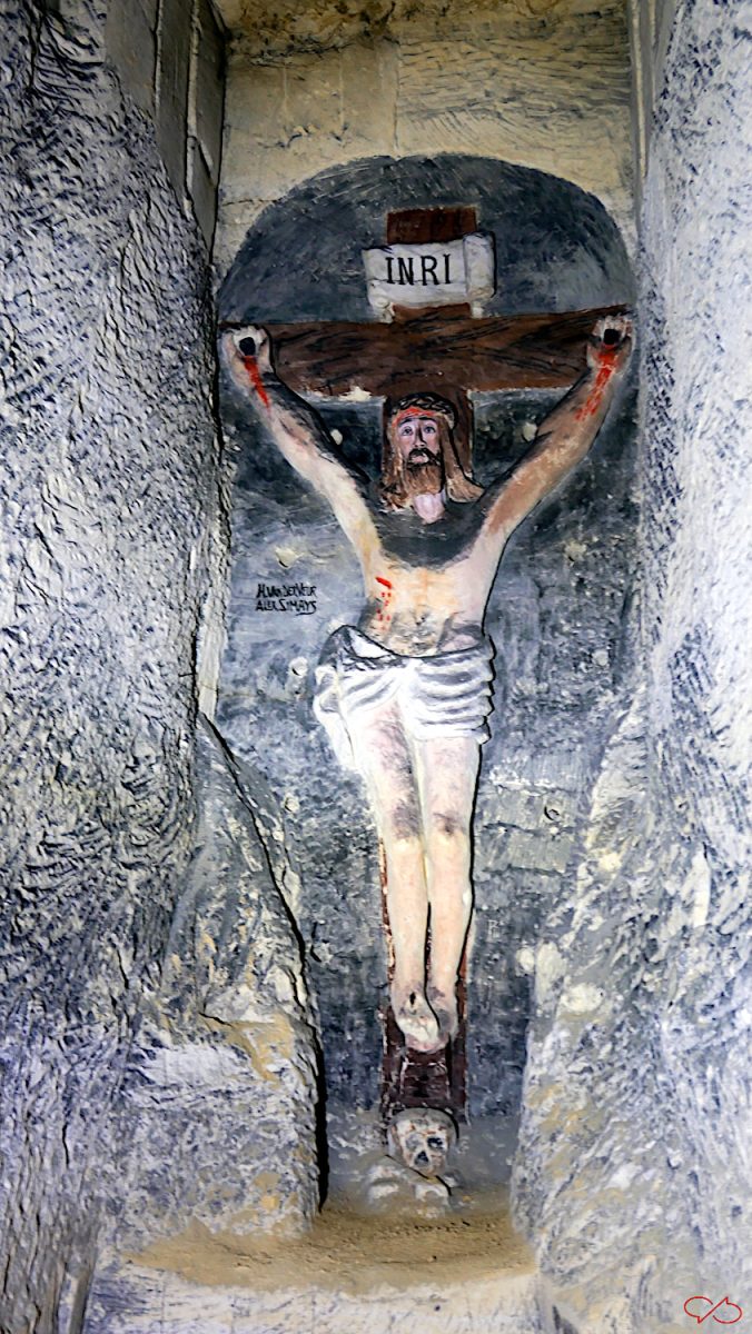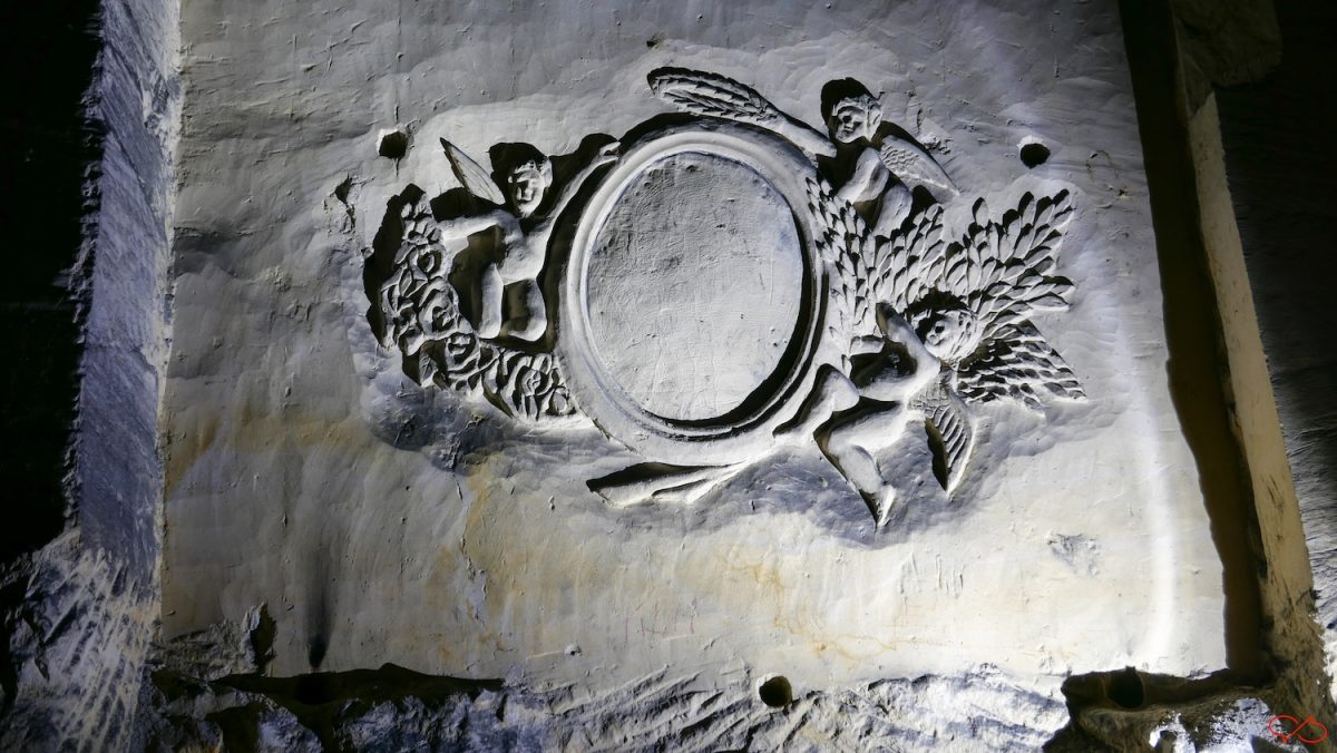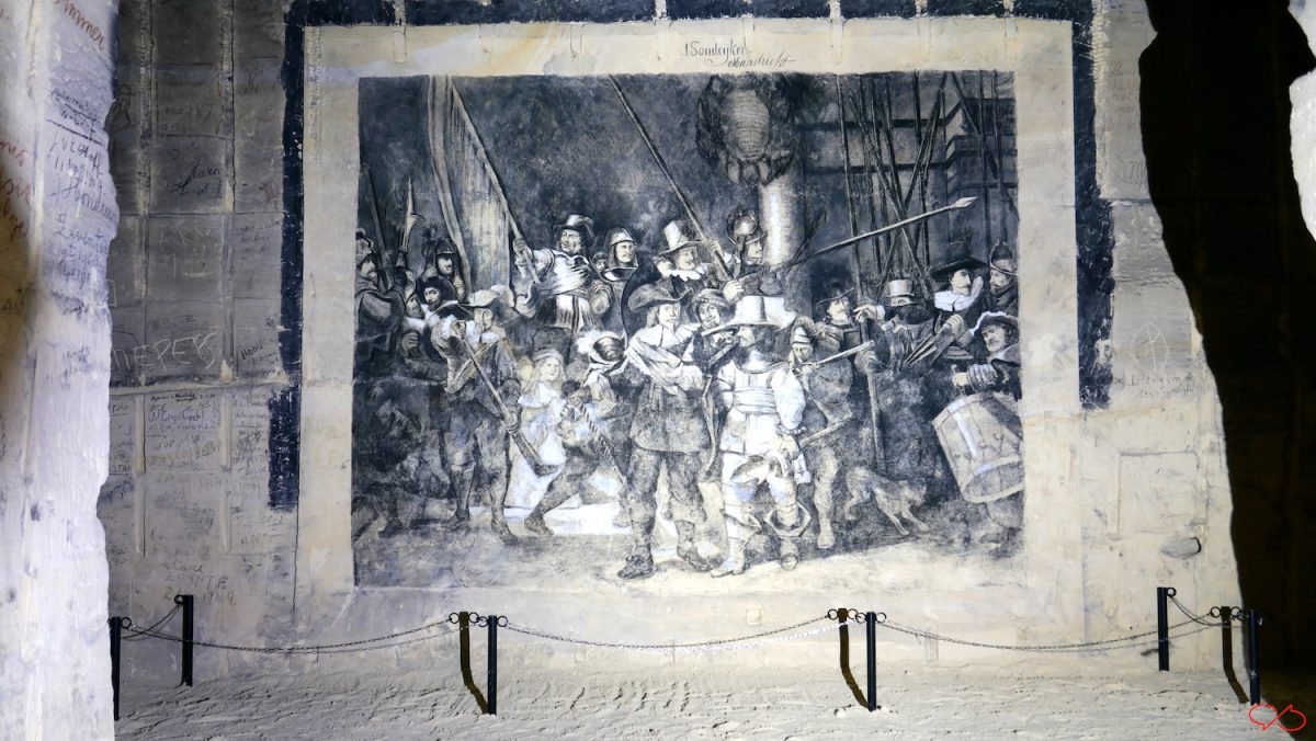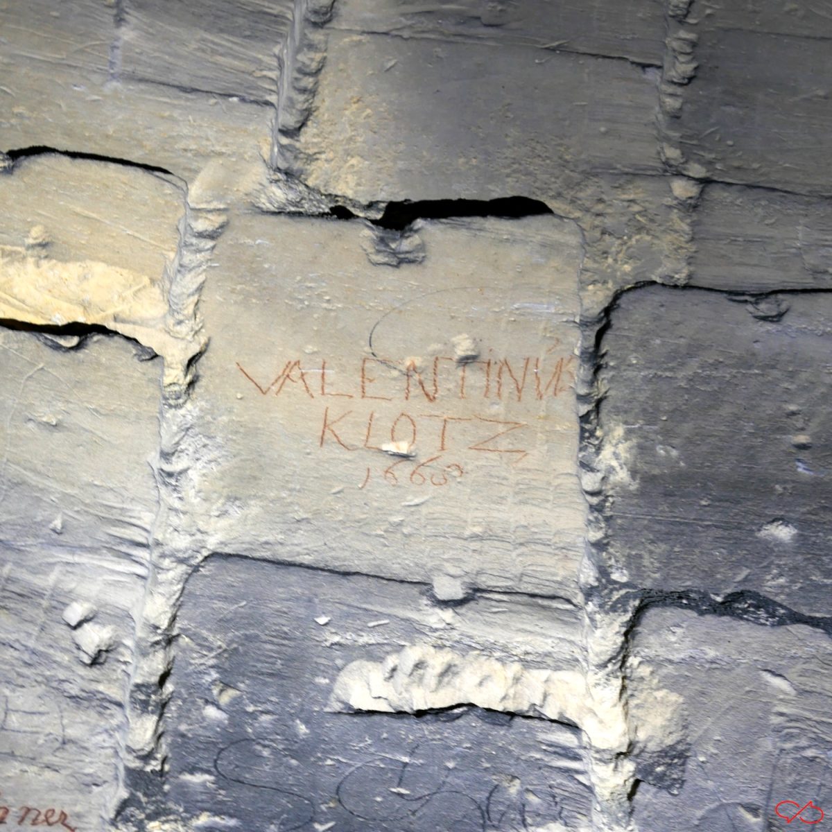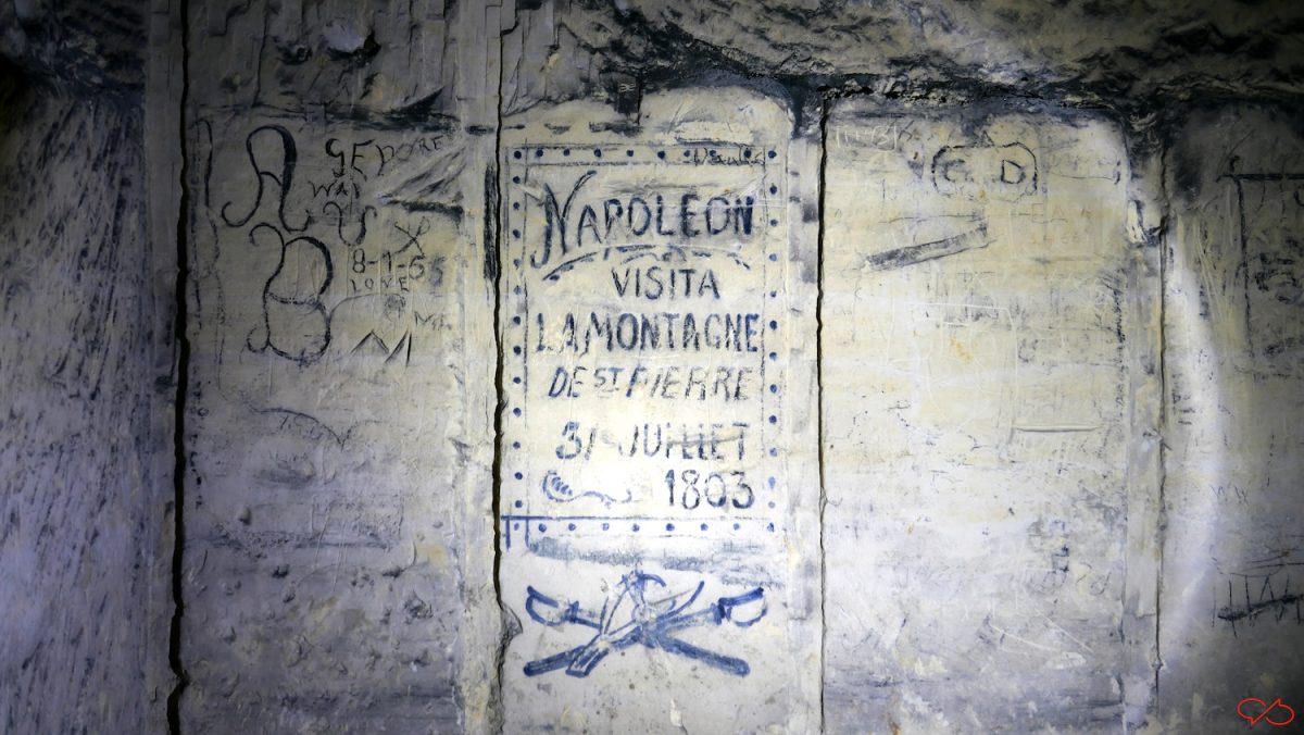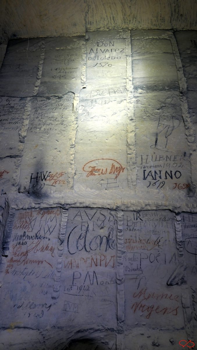 Ik was hier. Ik ook. En kijk mij… Op heel veel plaatsen hebben bezoekers hun naam in de mergel gekrast. Omdat de gangen van boven naar beneden zijn ontgonnen, zien we de oudste bovenaan. Don Alvarez De Toledo uit 1570. Het was de hertog van Alva. IANNO uit 1619, Napoleon uit 1803 en de Maastrichtse tekenaar Valentinus Klotz uit 1668, hij zou een jaar later met Josua de Grave samen prachtige tekeningen maken van de stad en omgeving.
