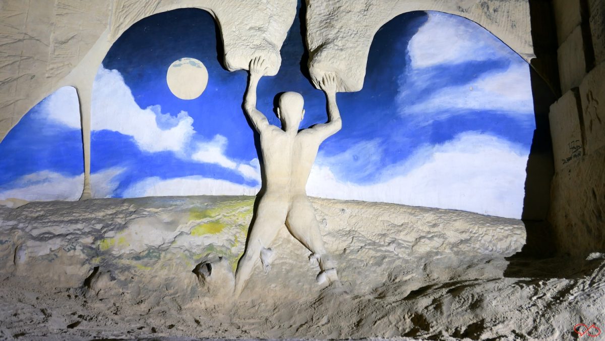 Op tal van plaatsen is kunst te vinden. Als muurtekeningen en als beeldhouwwerken. Een reliëf van drie engeltjes rond een leeg medaillon, een schitterend gekleurd beeld van een Maashagedis, een reclame voor margarine en natuurlijk de Nachtwacht. Maar ook dit. We kennen Hansje Brinkers die zijn vingertje in de dijk hield en zo een overstroming voorkwam. Hier zien we iemand die in z’n eentje de berg omhoog houdt.