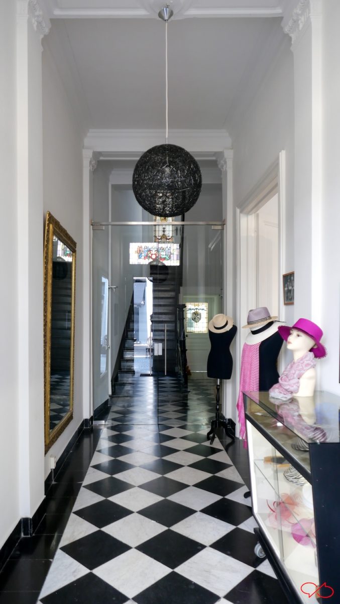 De entree is werkelijk prachtig: een statige hal met een vloer van zwart-wit geblokte tegels. Het atelier is in de achterkamer.