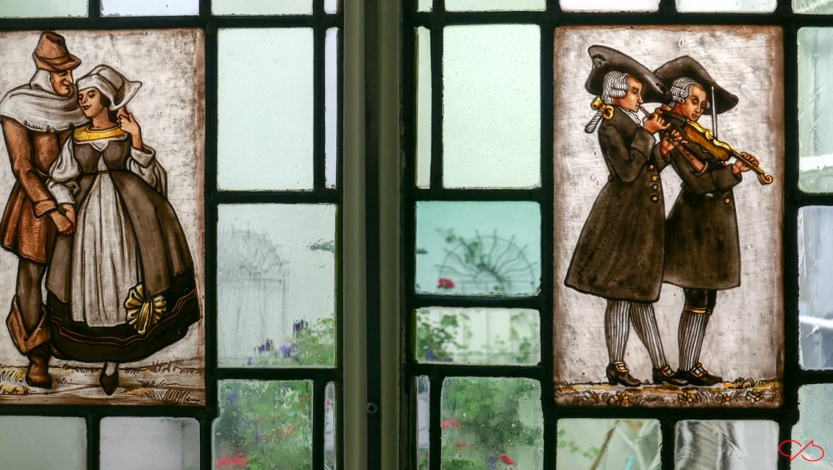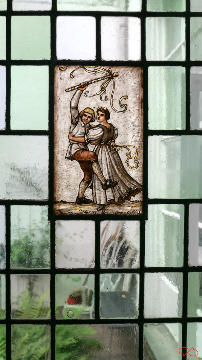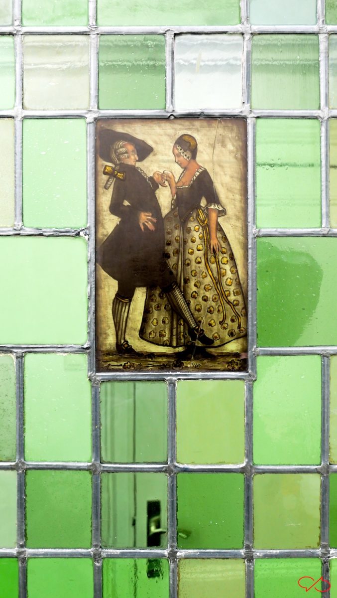 Het pand was de woning van een oud-burgemeester. Er is prachtig glas-in-lood, gebrandschilderd en gezandstraald glas. De voorstellingen zijn erg aardig. Een dansend stel. Zij heeft een geel lint om haar middel en hij een geel lint aan een versierde stok. Een ander paneeltje met een verliefd stel in middeleeuwse kleding. En twee musicerende heren, achttiende eeuws gekleed. En een dansende dame en heer uit dezelfde tijd. Alle mensen hebben iets op het hoofd. Hier passen ambacht en pand perfect bij elkaar.
