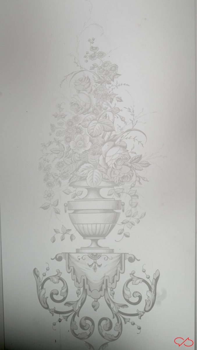 De vierde foto is geen kleurplaat, maar gezandstraald matglas. Een gestileerde vaas vol bloemen en ranken. Het is ragfijn gedaan.
