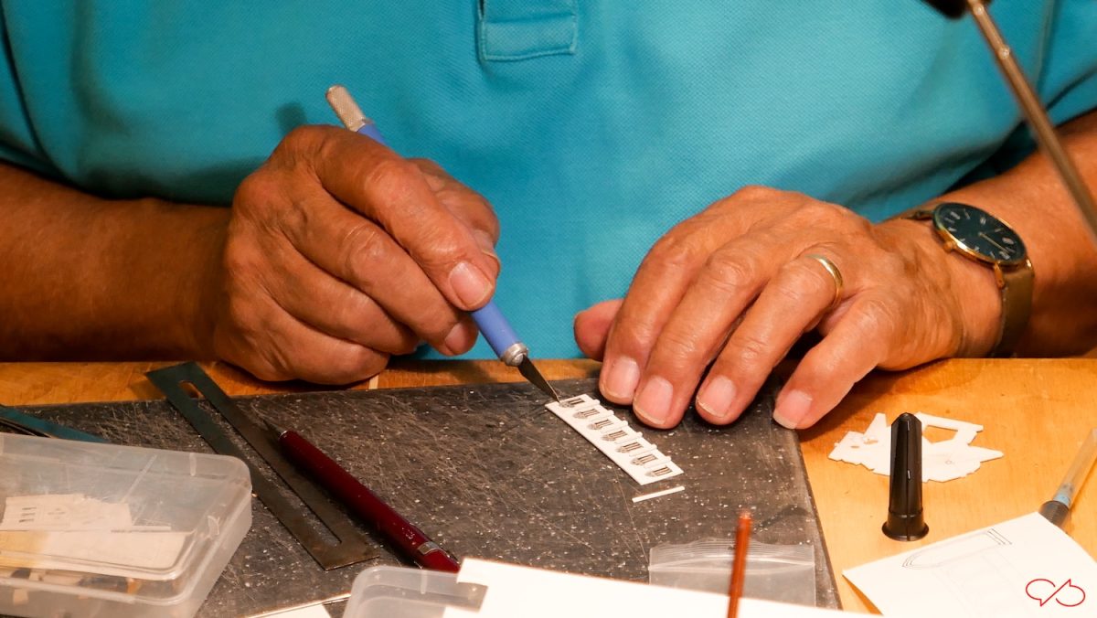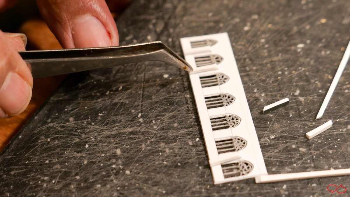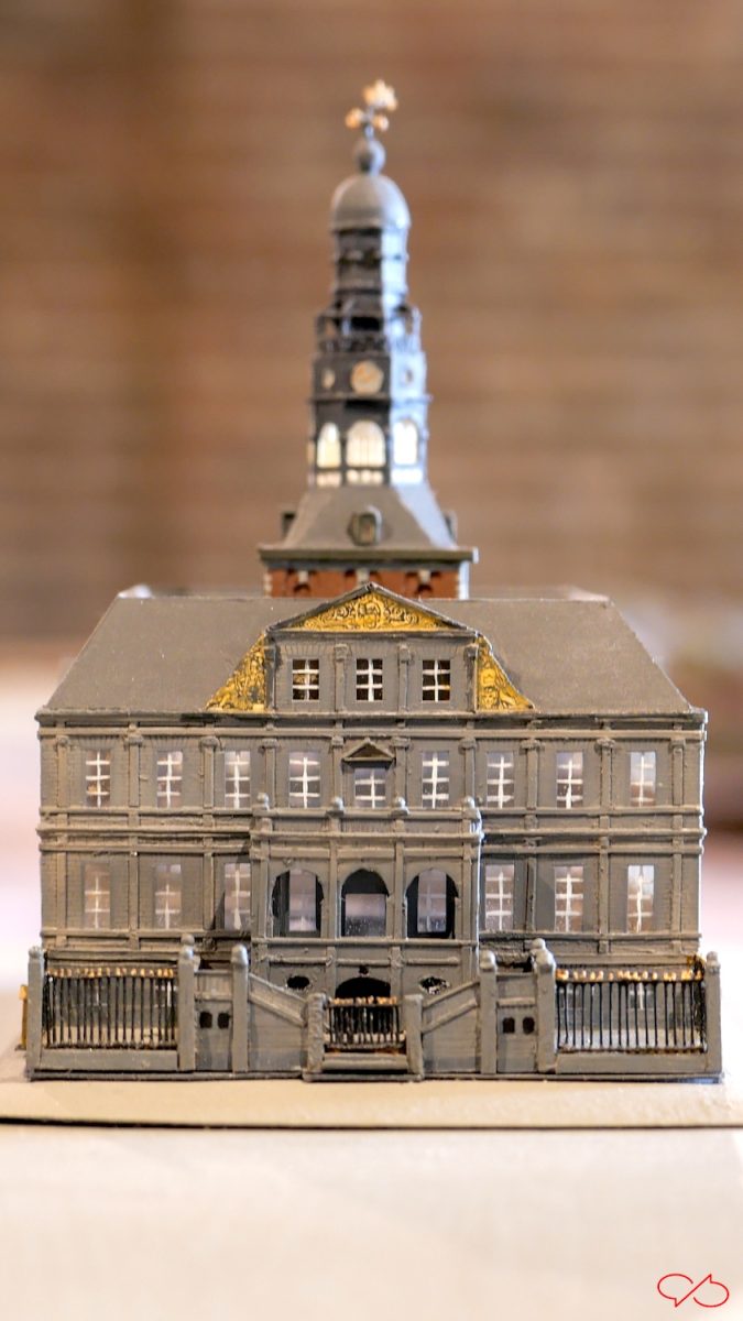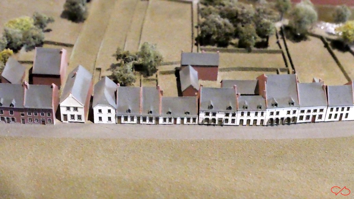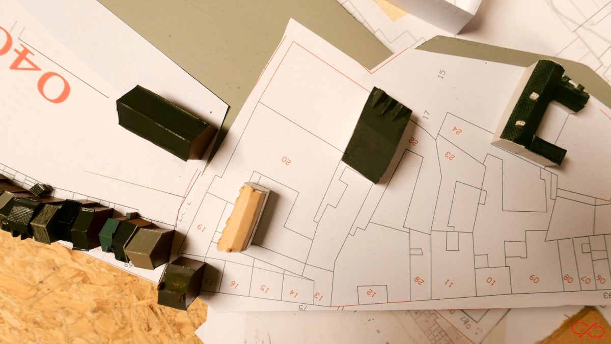 Natuurlijk moeten al die gebouwen gemaakt worden. Dat begint met onderzoek: hoe heeft het er écht precies uitgezien in 1867. Dan intekenen, afdrukken, uitsnijden, samenvoegen, schilderen en dat alles zééér nauwkeurig. De schaal is 1:500. Wat in werkelijkheid 5 meter is, is hier 1 centimeter. Een deur van een meter breed, is hier twee millimeter.