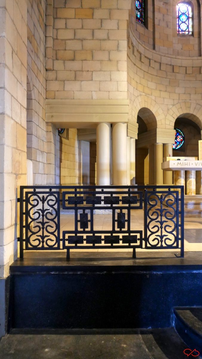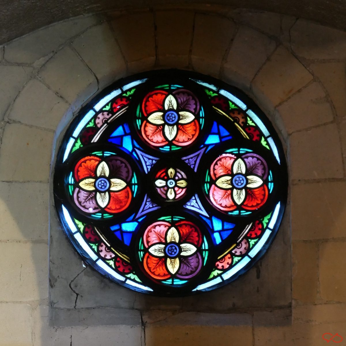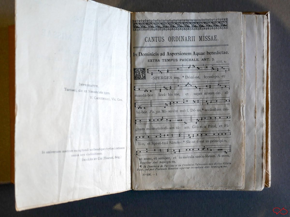 Bekijk dat roosvenster eens. Wat een kleur. En in een boekenkastje een missaal uit 1920, volledig in het latijn.