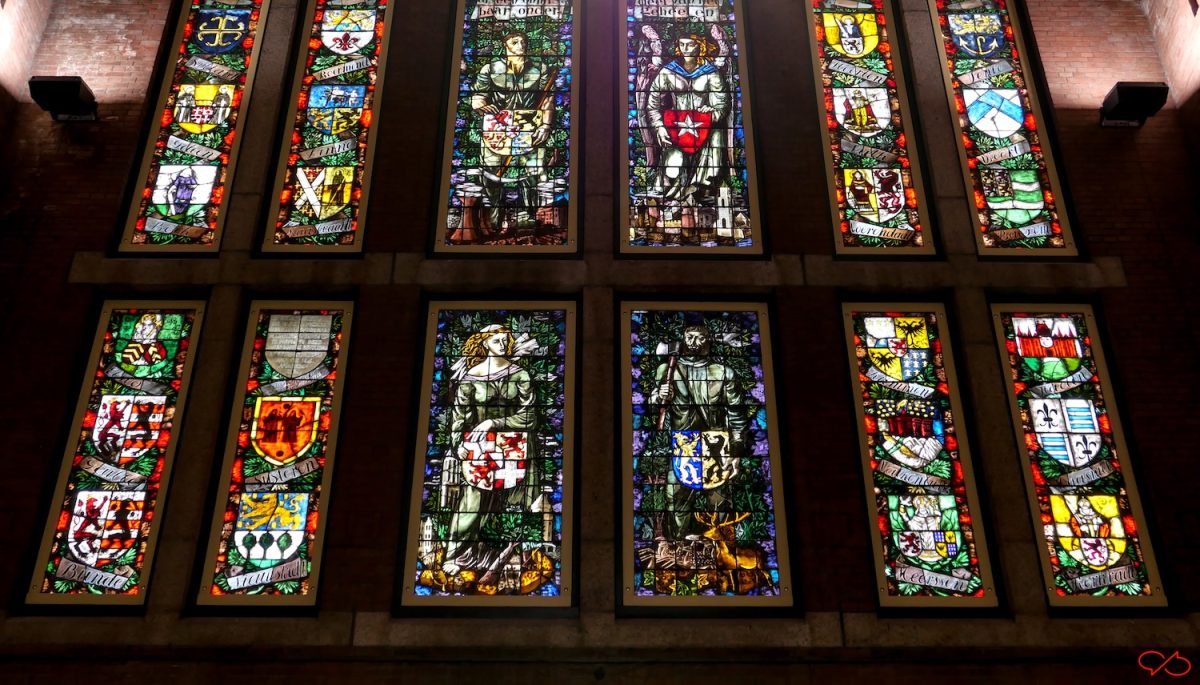 Het oorspronkelijke glas-in-lood is in de oorlog verwoest en in 1949 vervangen door dat van Charles Eyck. De namen van alle Limburgse stations staan er in. Het was een gift van het stadsbestuur.