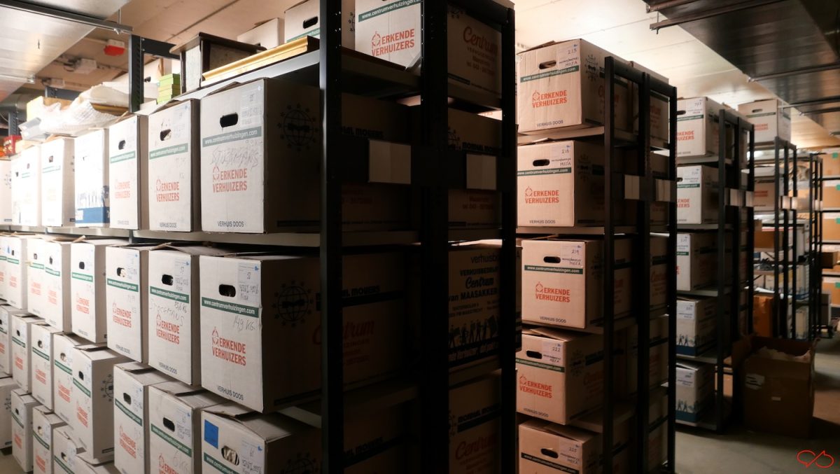 Ik mocht vandaag kijken in de depot in het souterrain. Er is er ook nog een op niveau 6, maar eerst deze. Eindeloze rijen met kasten met dozen, keurig gedocumenteerd.
