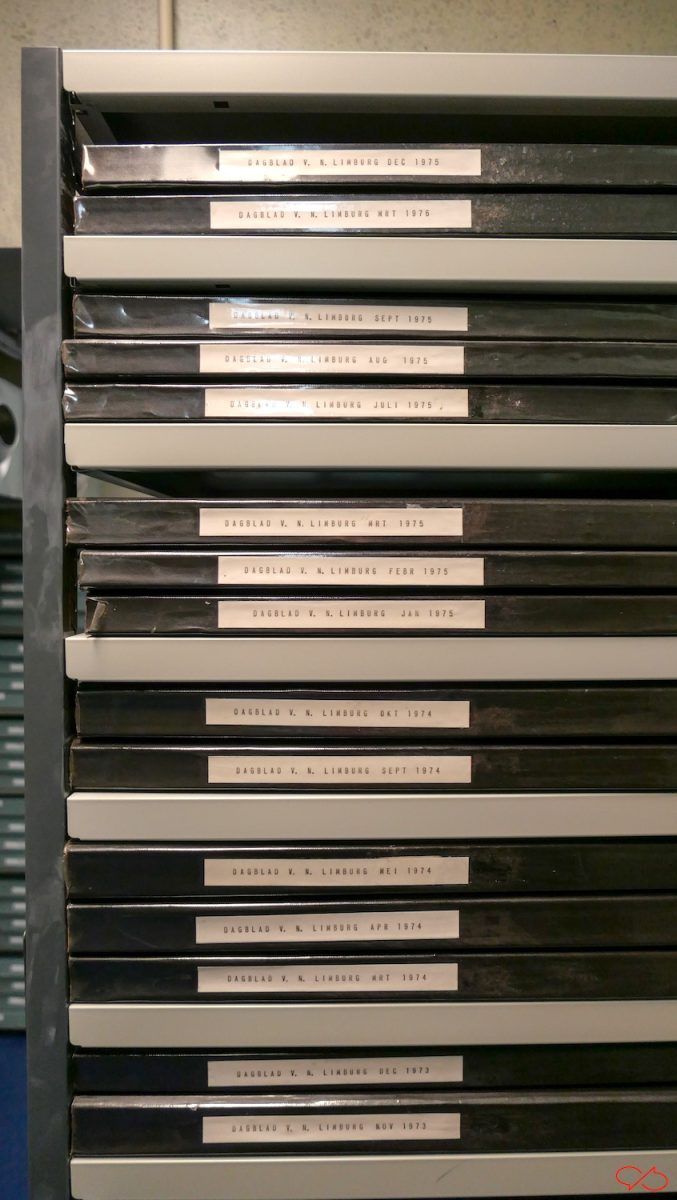 Er liggen stapels kranten, netjes geordend. Hier een stapel Dagblad van Noord-Limburg uit 1975.