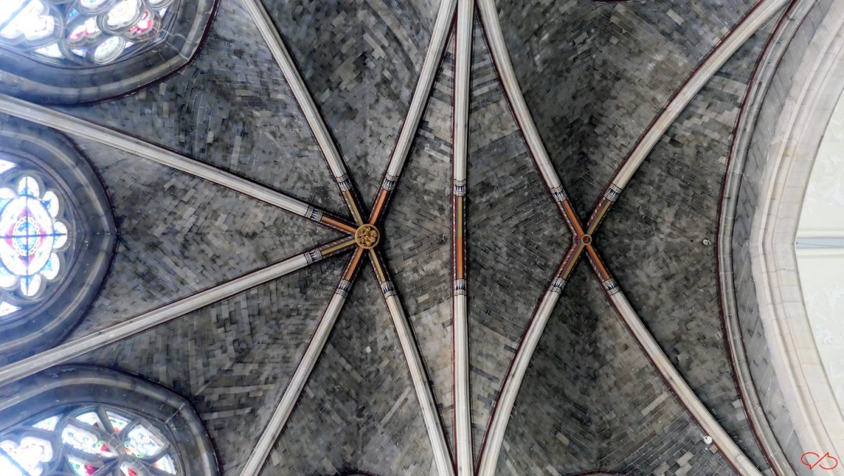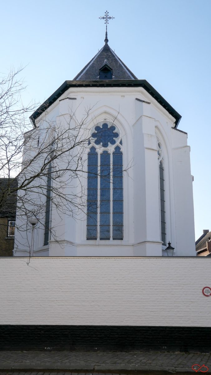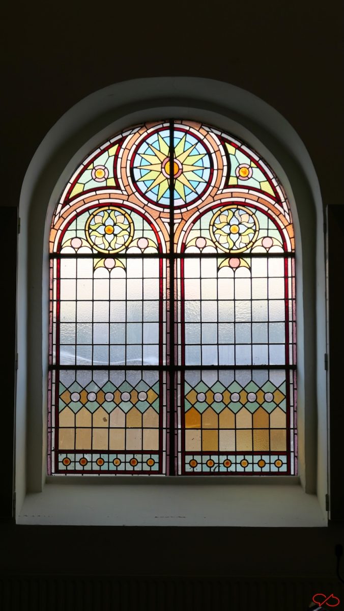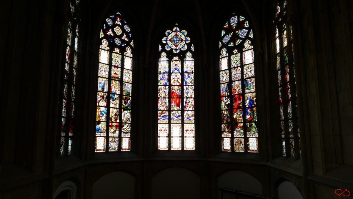 De absis van de kapel, de vijfhoekige achterkant, stamt uit 1492. De muren zijn van mergel en in de muren zien we lancetvensters met glas-in-loodramen. En we kijken even naar het plafond aan de binnenkant. Ooit bestond de kapel uit twee verdiepingen, een dubbelkapel. We zien het nog aan de dubbele rij lage glas-in-loodramen.