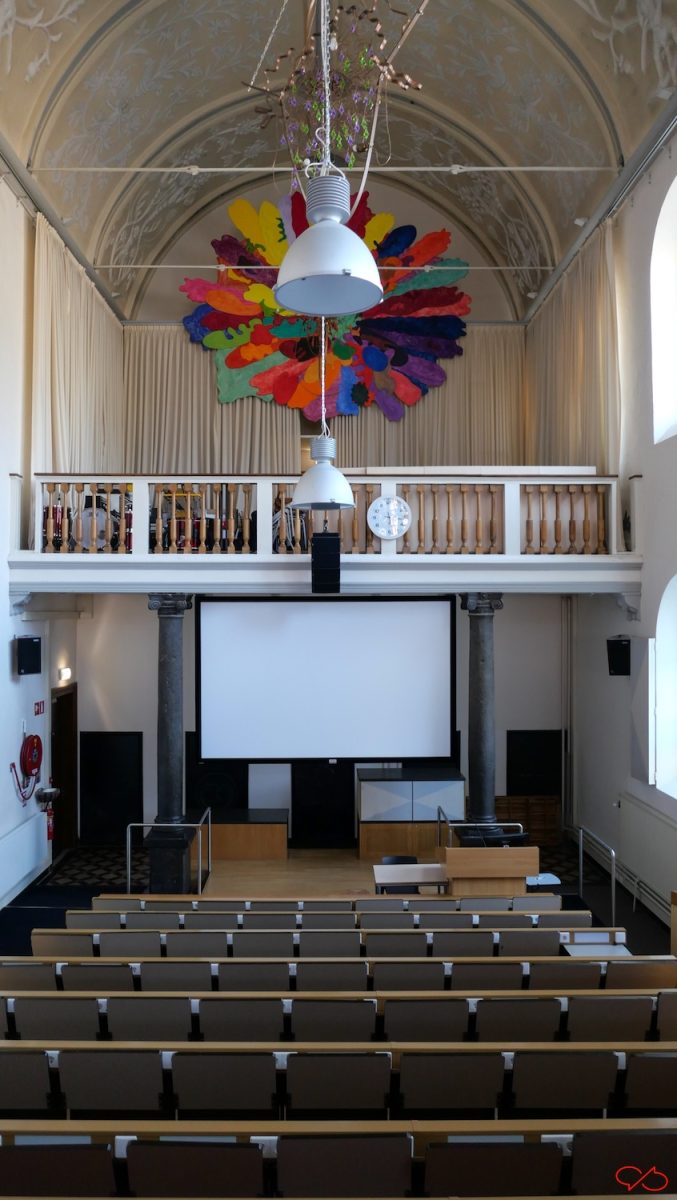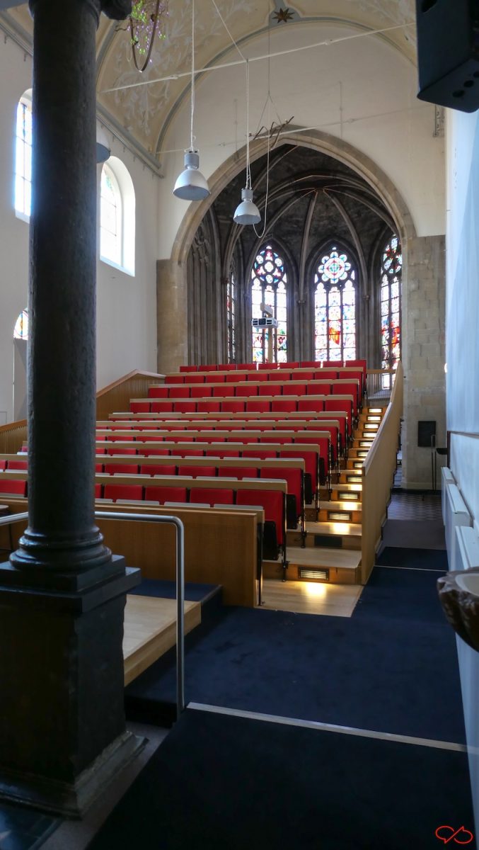We kijken nog even rond in het schip. We zien de koortribune. Op de plaats van het orgel hangt een veelkleurig kunstwerk. Er staan allerlei muziekinstrumenten voor studenten.