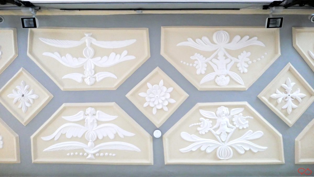 En een stukje van het plafond van onder de koortribune. Engeltjes op bloemen in wit, crème en lichtblauw. Het tongewelf van de kapel in in dezelfde stijl versierd.