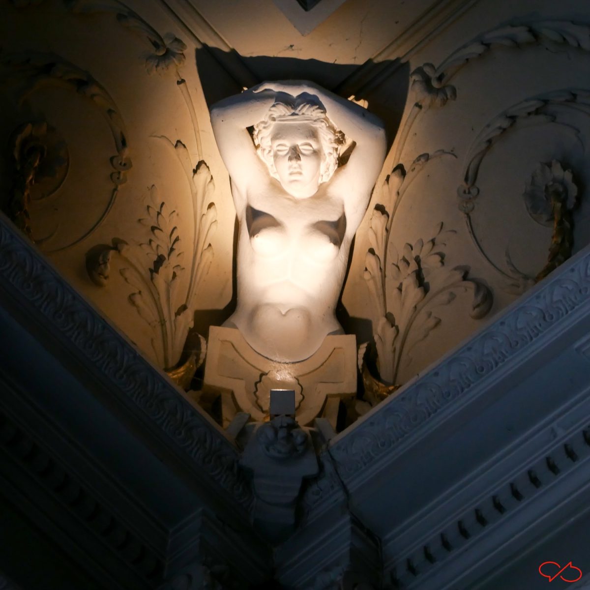 Het gebouw staat er sinds 1762. In 1867 werd er flink verbouwd, de balzaal werd verhoogd door de vloer van de eerste verdieping weg te breken. Vandaar de blinde ramen. En sindsdien is de zaal nauwelijks veranderd, prachtige ornamenten.