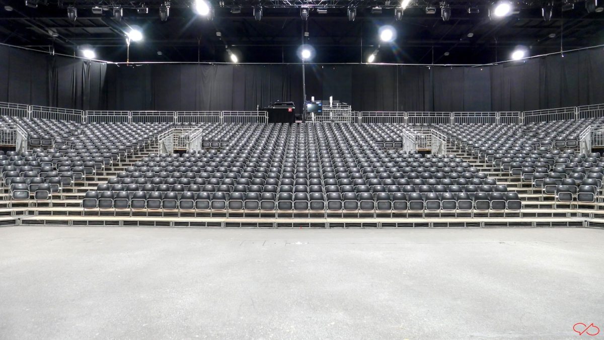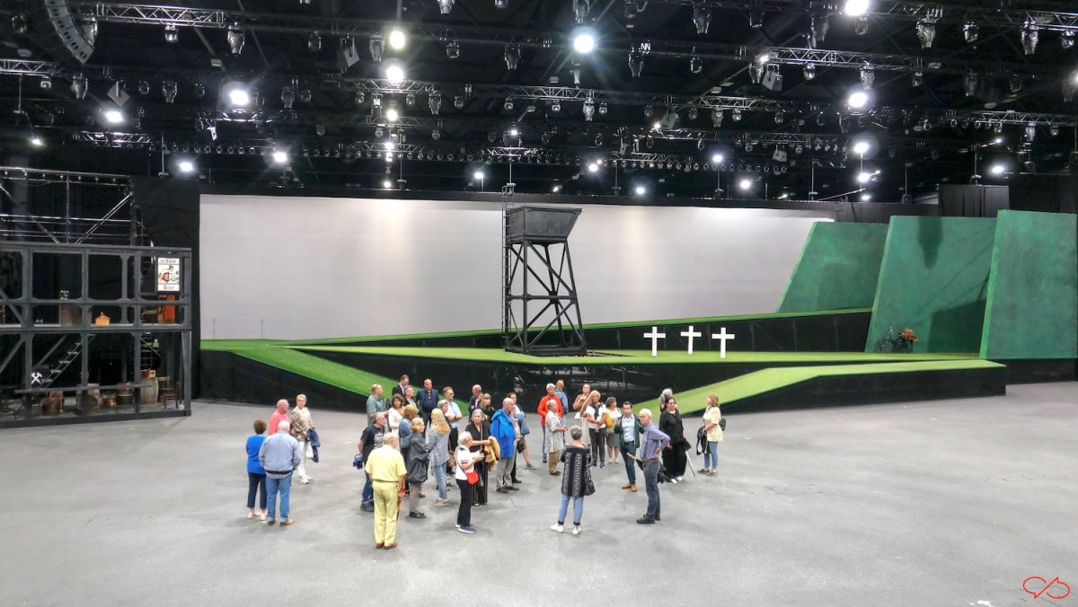 Het theater. Ik kon mee met een rondleiding achter de schermen. In een van de hallen van het MECC wordt de musical uitgevoerd. We zien de tribune. Die ziet er zo strak en kaal uit, maar tijdens de voorstelling is het licht gedempt en is de sfeer natuurlijk heel anders. Het podium geeft het heuvelachtige Limburgse landschap weer met een mijntoren. En daarboven de zeer indrukwekkende verlichting.
