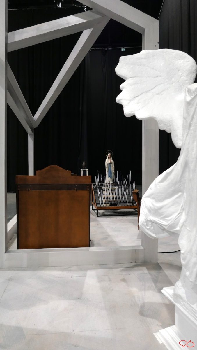 De decors zijn verrijdbaar zodat ze snel op de juiste plaats kunnen worden gereden. We zien de brouwerij, een huiskamer en de kerk van kapelaan Odekerken. In het witte beeld vooraan staat de beschermengel van de kapelaan.