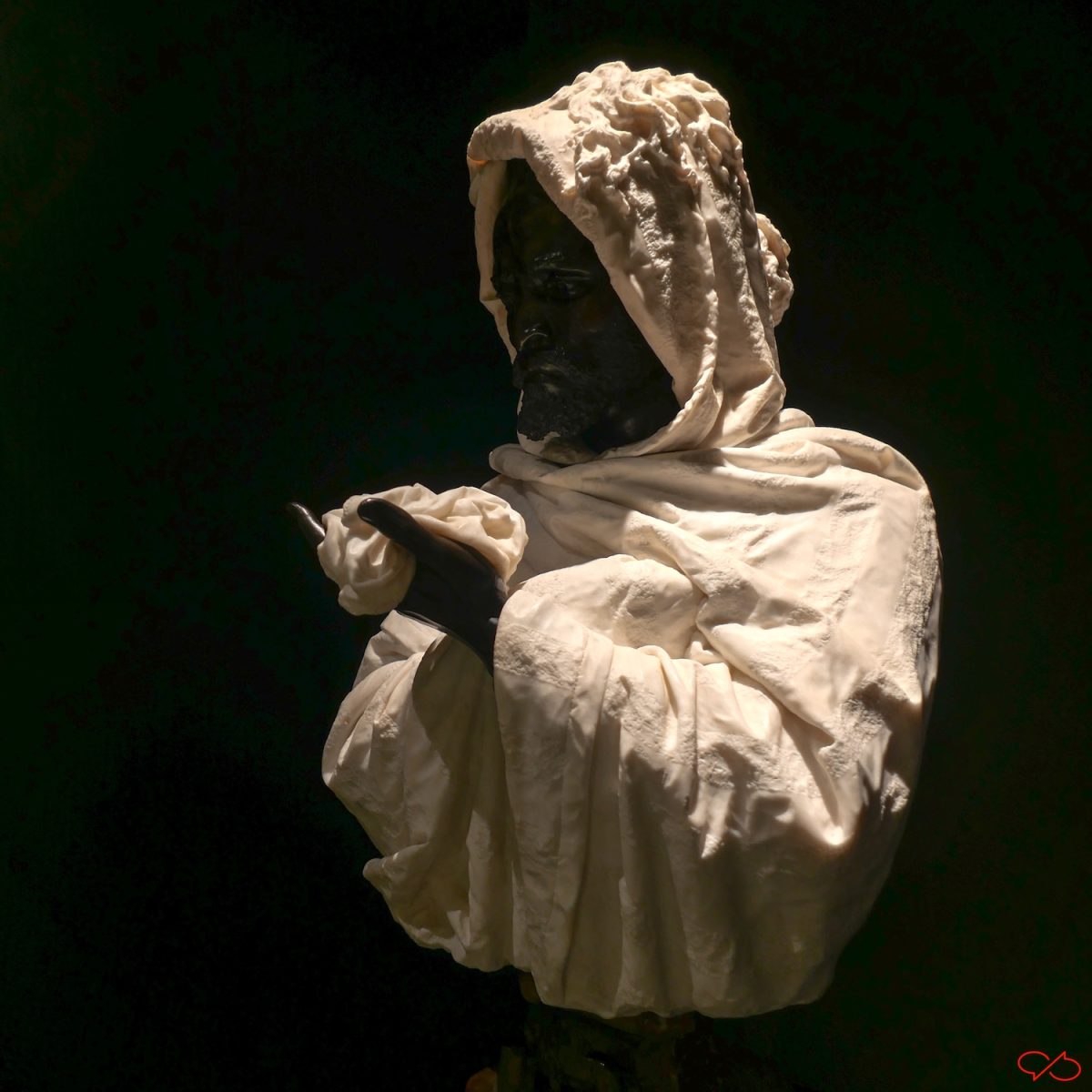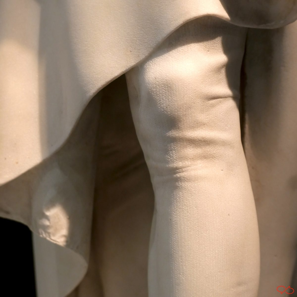 En dan de laatste foto. Het is de knie van Dante Alighieri, de 13de eeuwse Italiaanse dichter. Het beeld is van marmer, de knie dus ook. Verbaas je over het weefsel van de gebreide kous die in het marmer zichtbaar is. En de plooien. En over waartoe de mens óók in staat is.