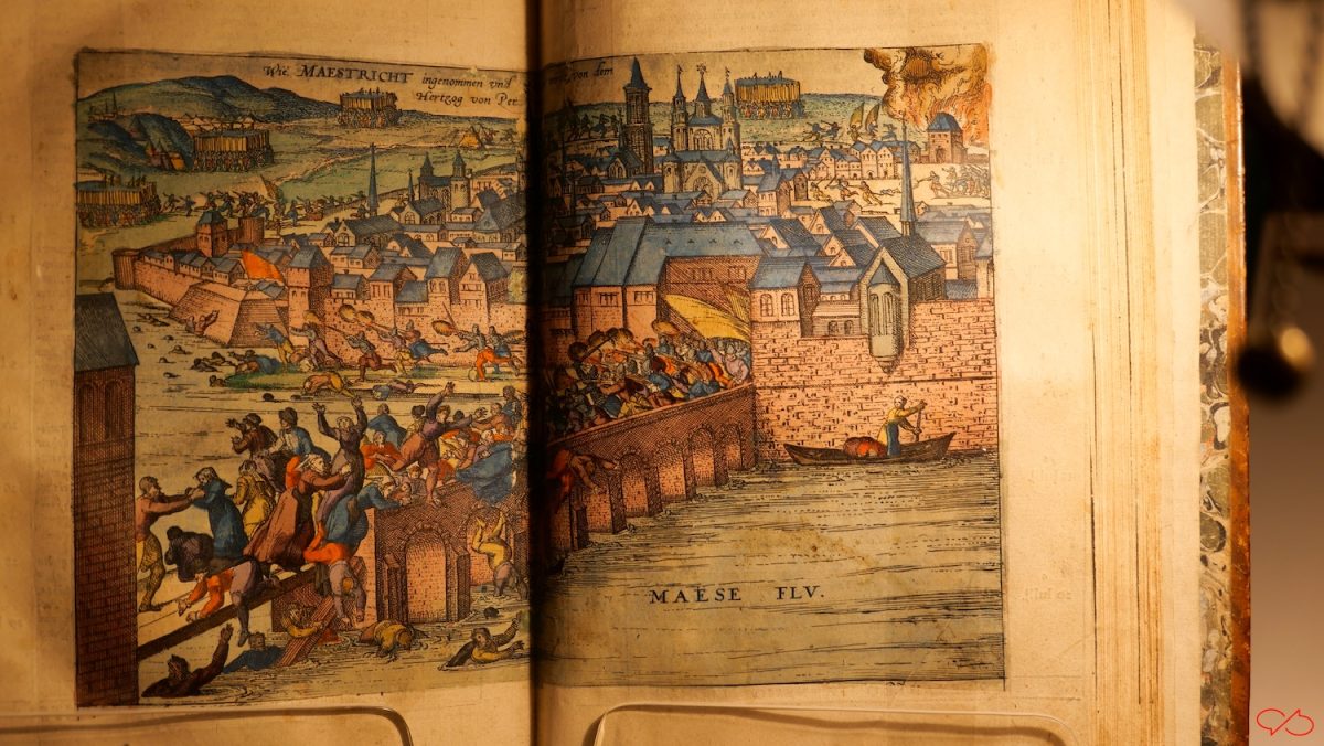 En dan een pagina uit een boek aldaar. Het stond een beetje in de schaduw, maar men was graag bereid om het op tafel te zetten met een lampje erbij. Het is Maastricht in 1579 ingenomen door de Spanjaard Farnese. Op de voorgrond de Aw Brögk met daarop de Spaanse Furie.
