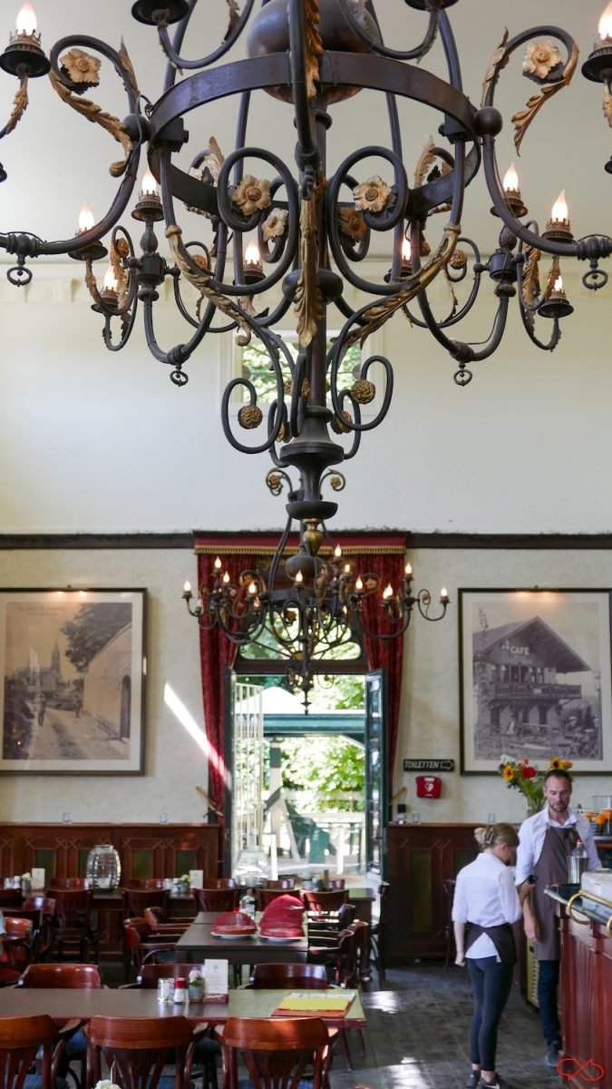 Buiten zijn terrassen, heerlijk zitten in de zon of onder een parasol. De sfeer binnen is ouderwetse grandeur, men ziet er 1846 nog aan af. Wie van historie houdt, komt ogen tekort.