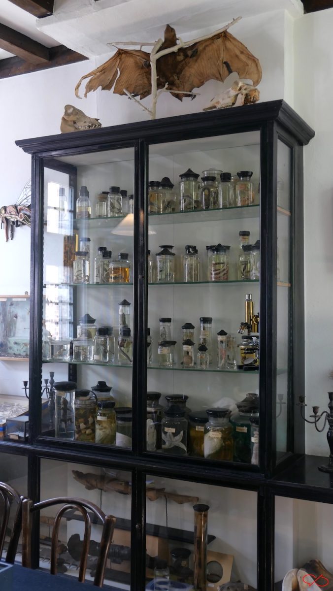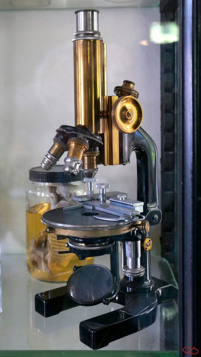 Een van de instrumenten om onderzoek mee te doen waren microscopen. Ook stonden kasten vol met lichaamsdelen van mensen en dieren op sterk water, ethylalcohol of formaline, zodat ze niet zouden rotten. En vreemde voorwerpen uit alle delen van de wereld, het is net een rariteitenkabinet.