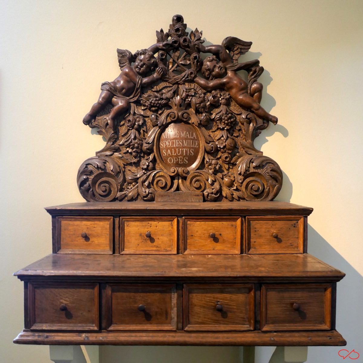 Net buiten de toegangsdeur staat een apothekerskast uit de 17de-18de eeuw met een uitgesneden kroon met twee cherubijnen in een levensboom. De tekst in het medaillon luidt: mille mala species mille salutis opes. Vrij vertaald: er zijn duizend ziektes, er zijn duizend medicijnen.
