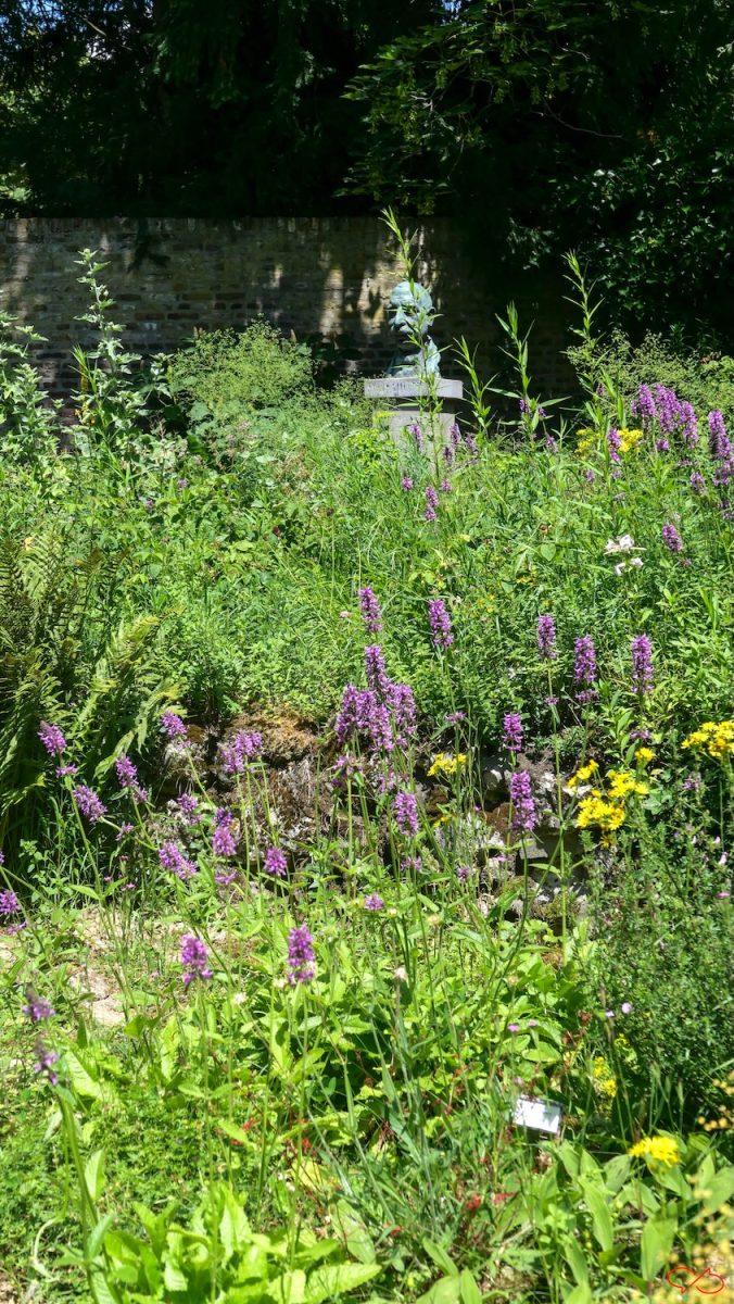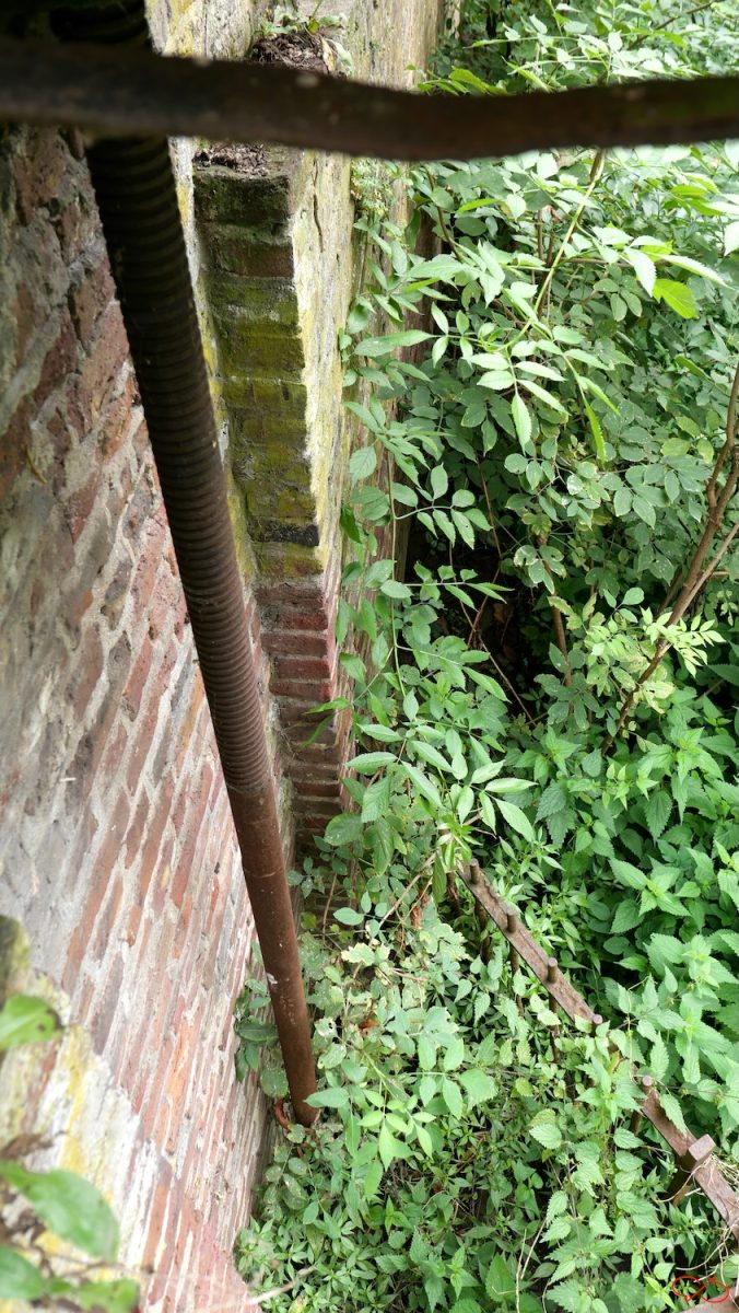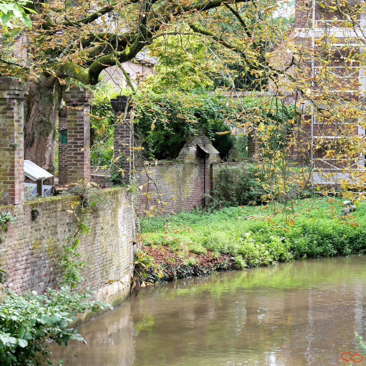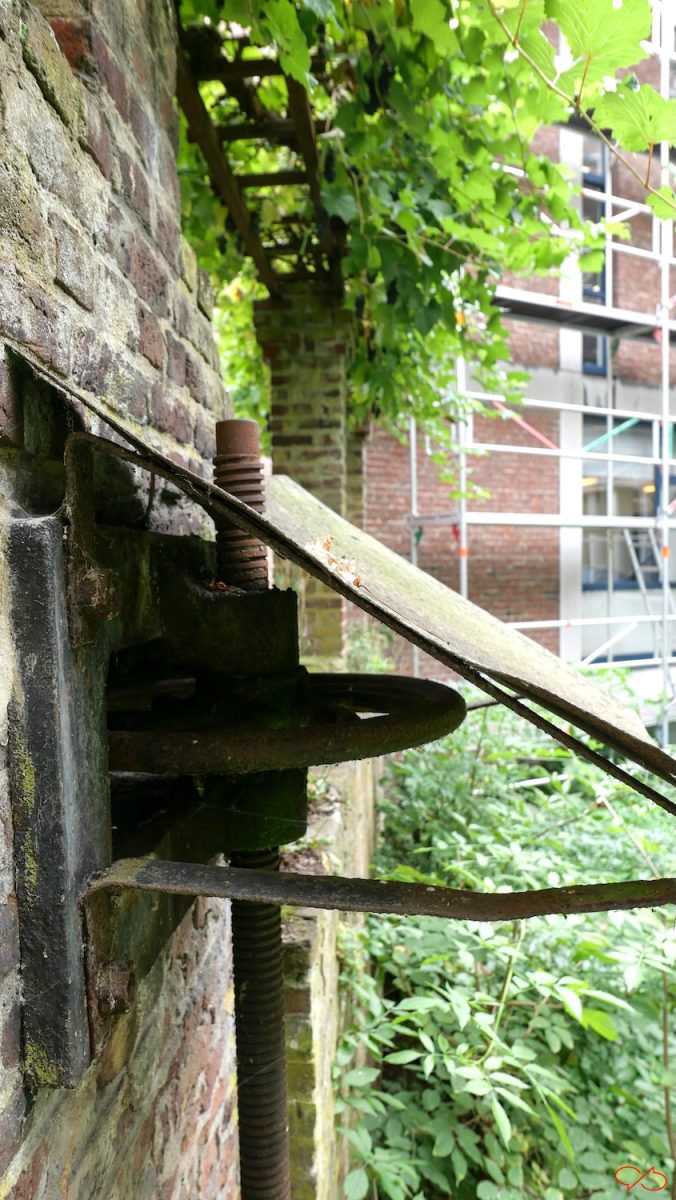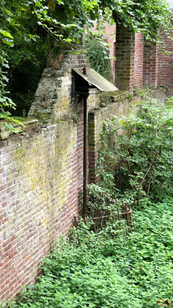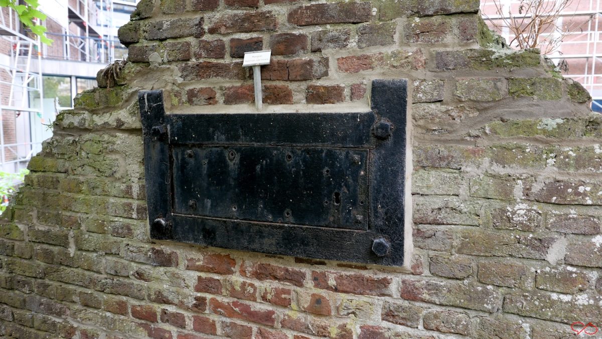 Let op: bijzonder! Tussen de tuin en de Jeker staat een muur. Daarin zit een gietijzeren luik dat geopend moet worden met een sleutel. Gelukkig kun je om de muur kijken om te zien wat er aan de andere kant zit. Een afdakje met daaronder een wiel aan een lange verticale as met schroefdraad. Draaien aan het wiel zorgt dat de as omhoog of omlaag gaat. Onderaan is een hekwerk met verticale spijlen. Om drijfhout tegen te houden. Het is dus een inlaat, een sluis, al is de schuif overwoekerd en niet zichtbaar.