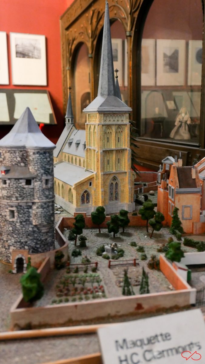 In de kapel, dat museumpje, staat een maquette van de vorige kerk die rond 1857 is gesloopt. We kijken van over de Maas en zien links de voormalige kruittoren en voor de kerk een ommuurde tuin. De maquette is gemaakt door HC Clermonts.