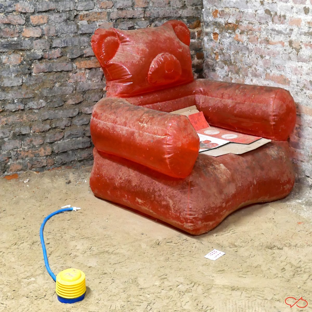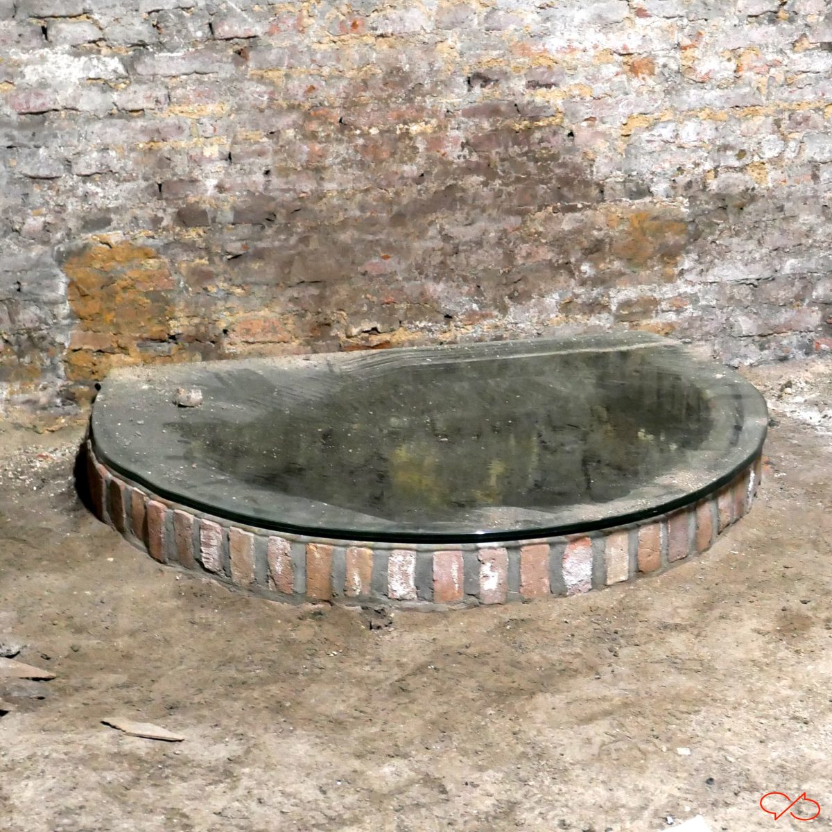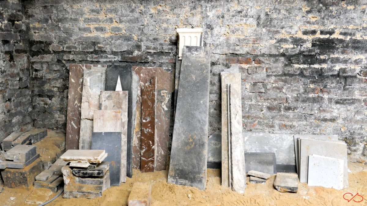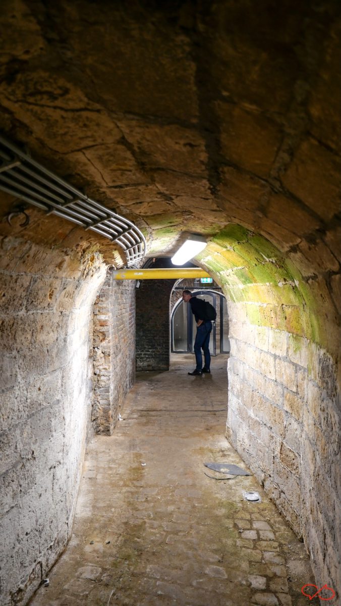 Onder het centrale deel is een gewelfde kelder. Het is een gang met verschillende zijruimtes. In die muren zitten stortgoten om (bijvoorbeeld) steenkolen naar binnen te laten rollen. In een hoek staan resten van een of meer schoorsteenmantels van marmer. En ergens staat een opblaasbare stoel, merk Pumpi, de pomp ligt er nog naast. En er is een met glas afgedekte waterput. Op een meter of drie diepte staat wat water.