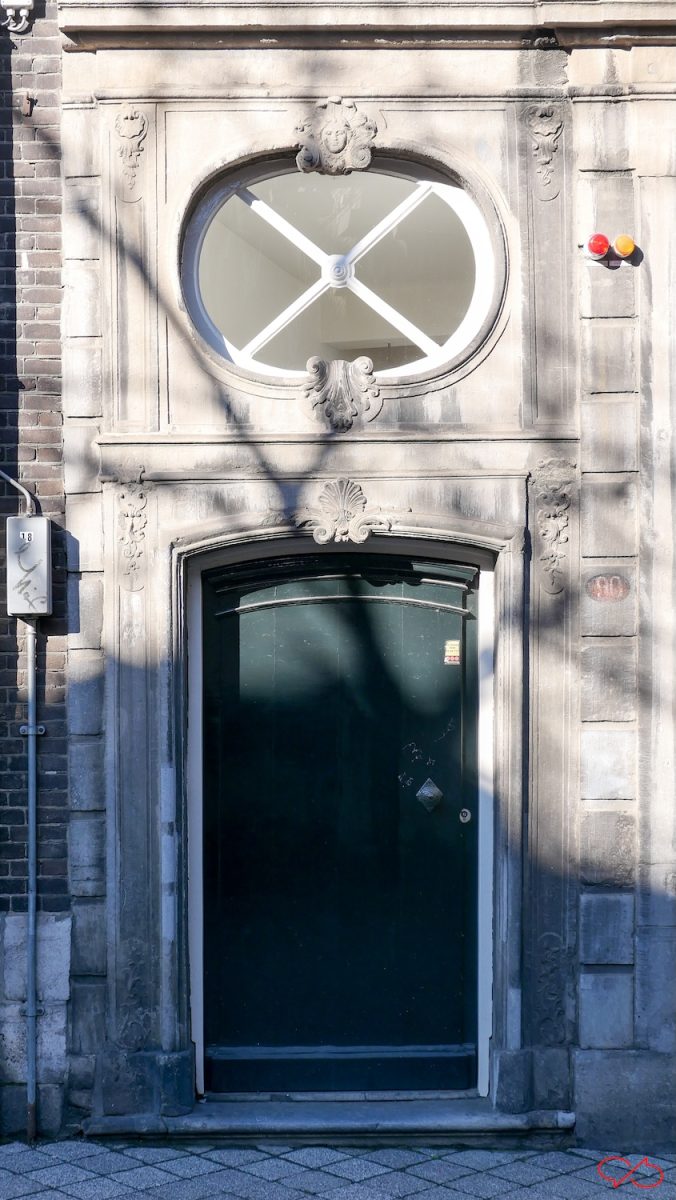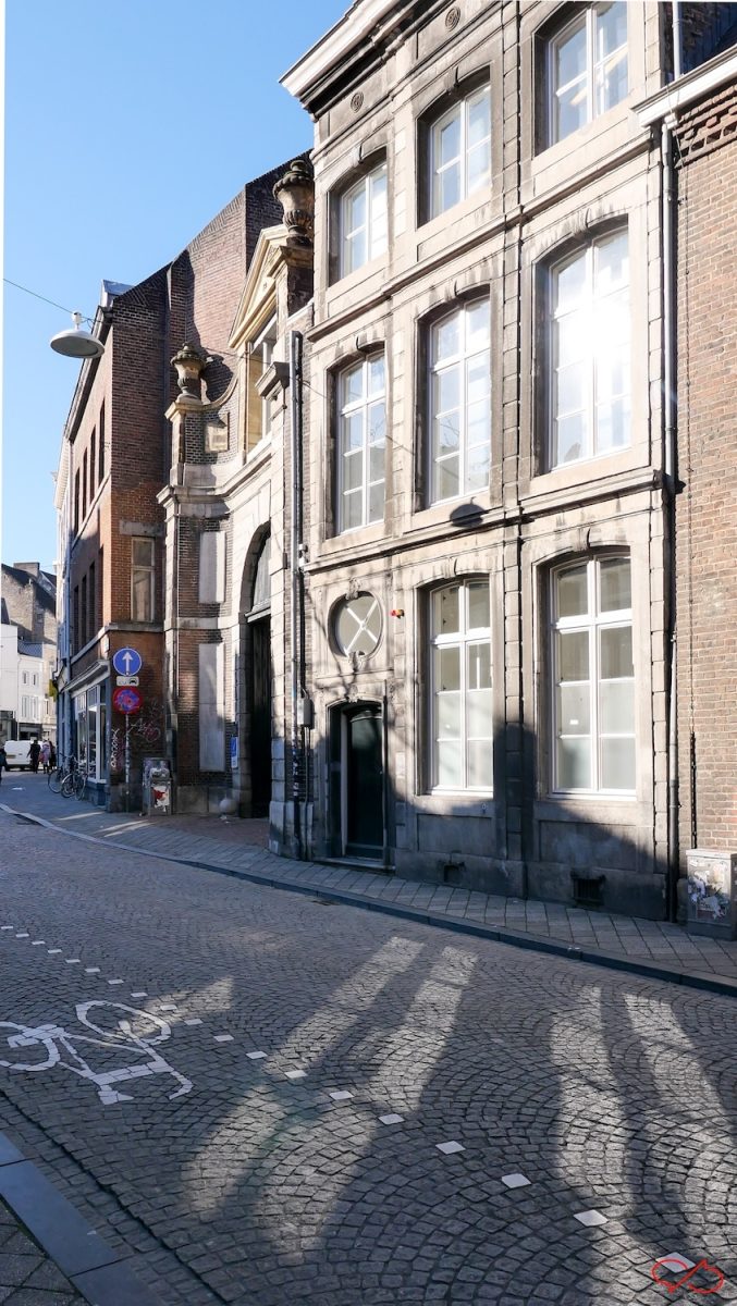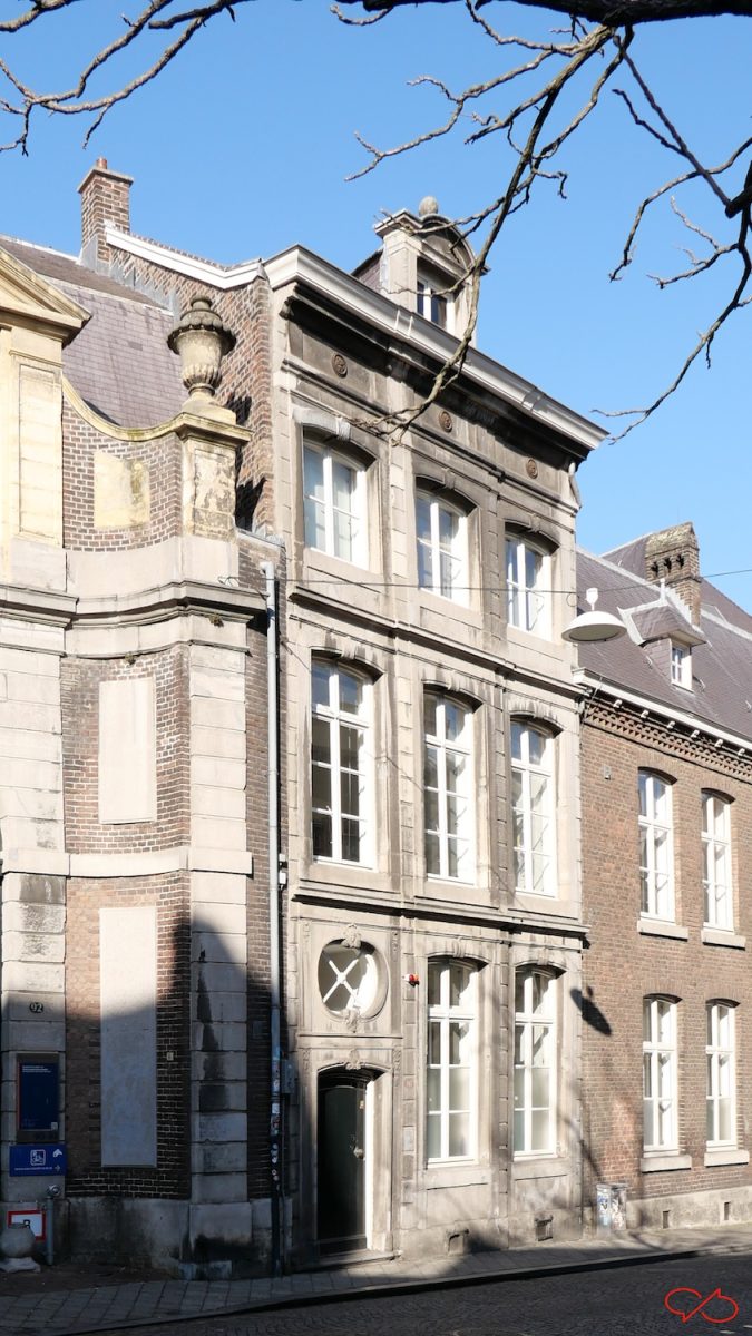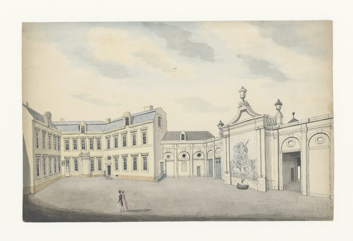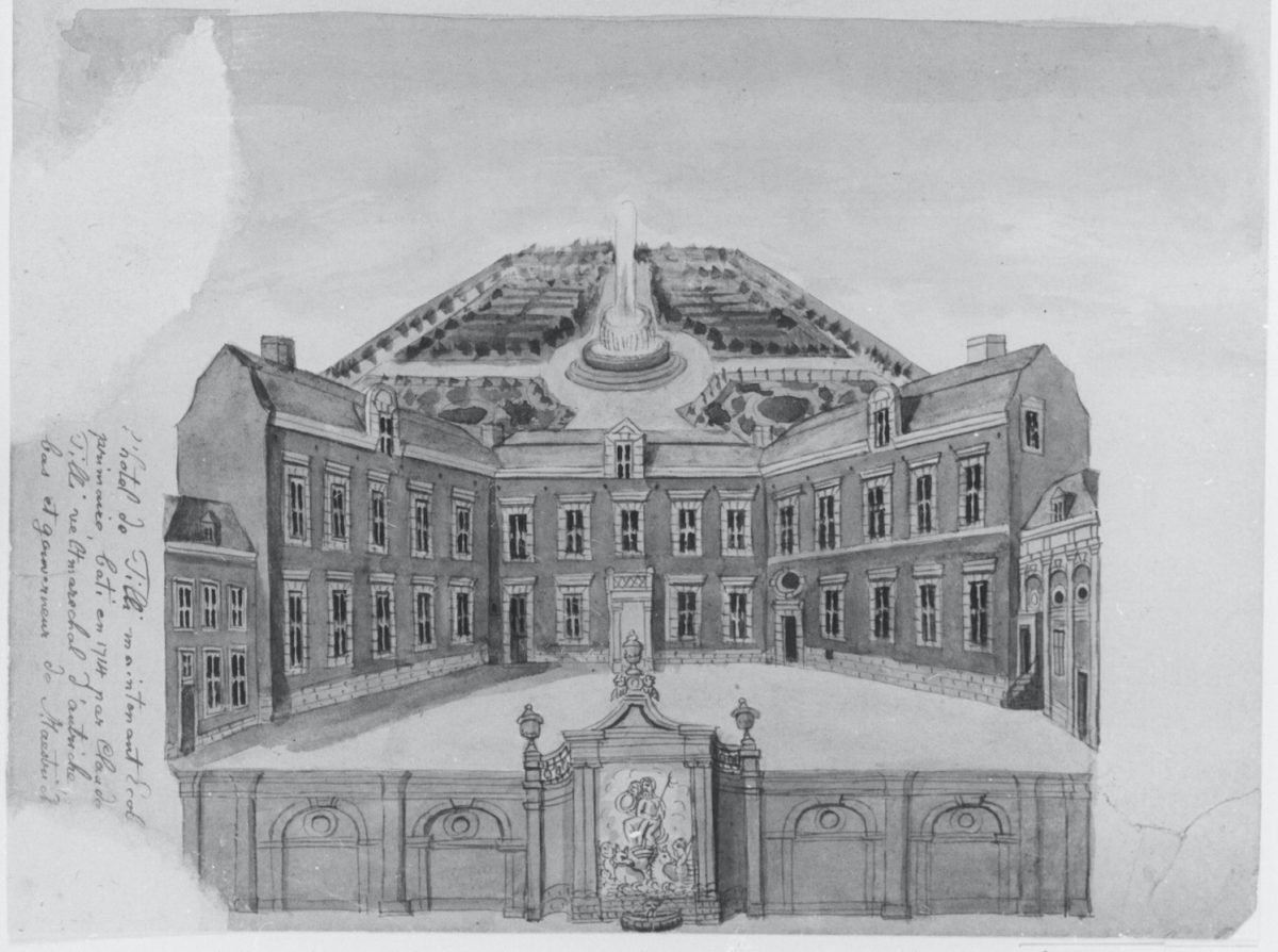 Bovenaan de Grote Gracht is de poort. Het complex is gebouwd in 1714 door Claude Frédéric t’Serclaes graaf van Tilly. Het was een stadspaleis in de vorm van een U rondom een cour. Die ligt direct achter de poort. Philippe van Gulpen heeft er twee tekeningen van gemaakt, wel ruim honderd jaar later, maar we hebben toch een mooi beeld van het oorspronkelijke complex.