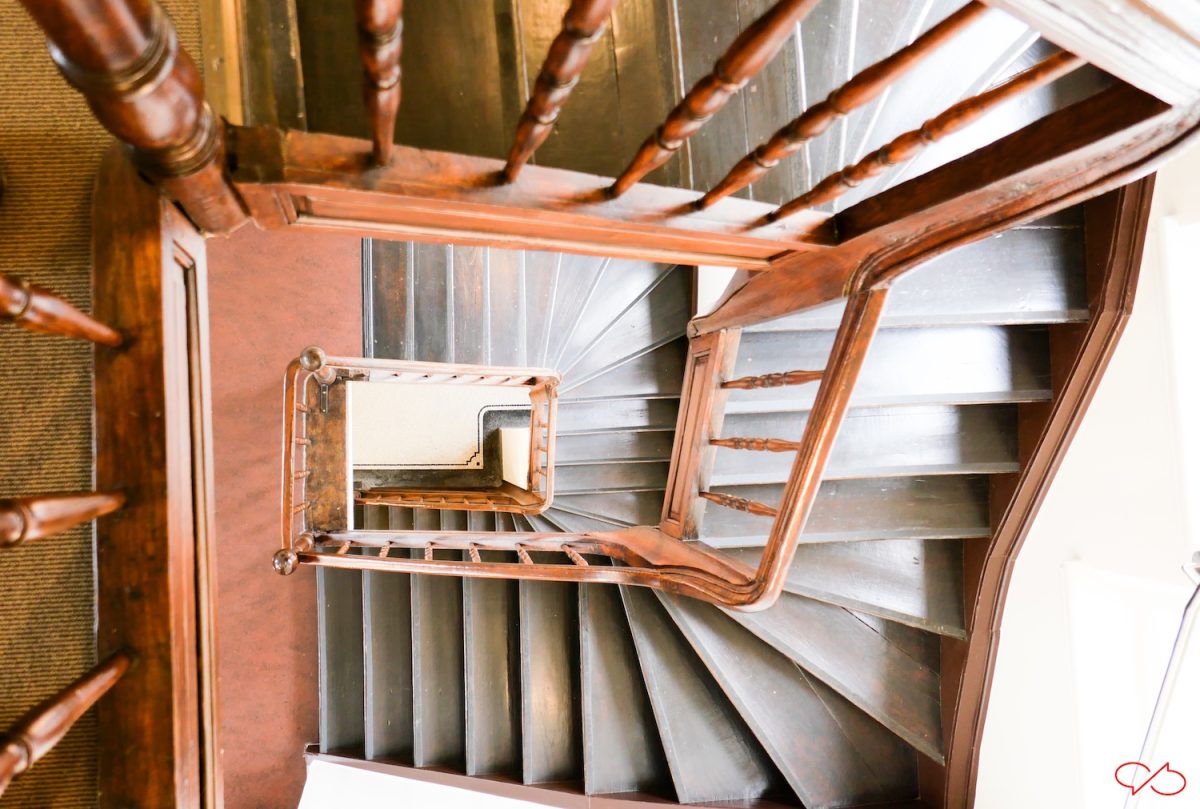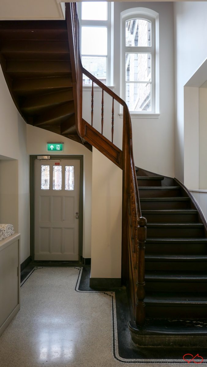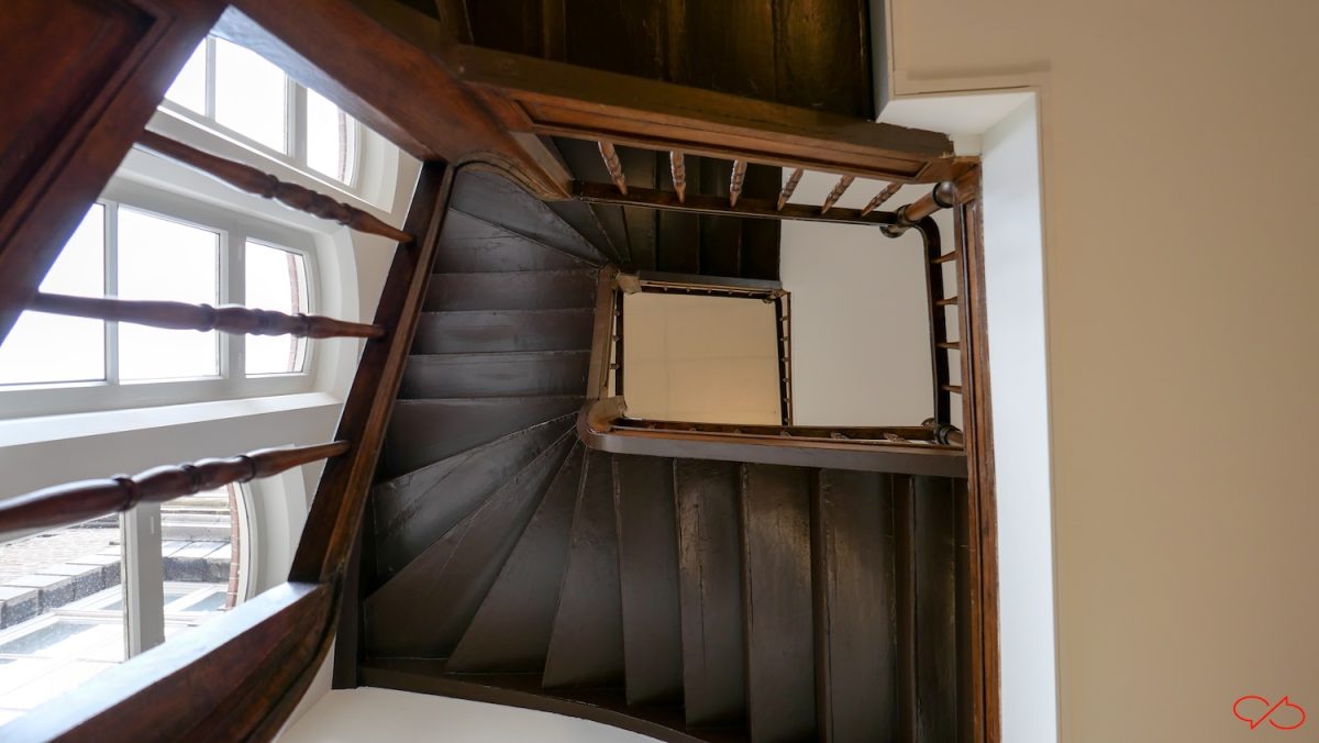Dan de trappen, eerst van beneden naar boven, dan terug. Het lijnenspel is fraai, spannend ook.