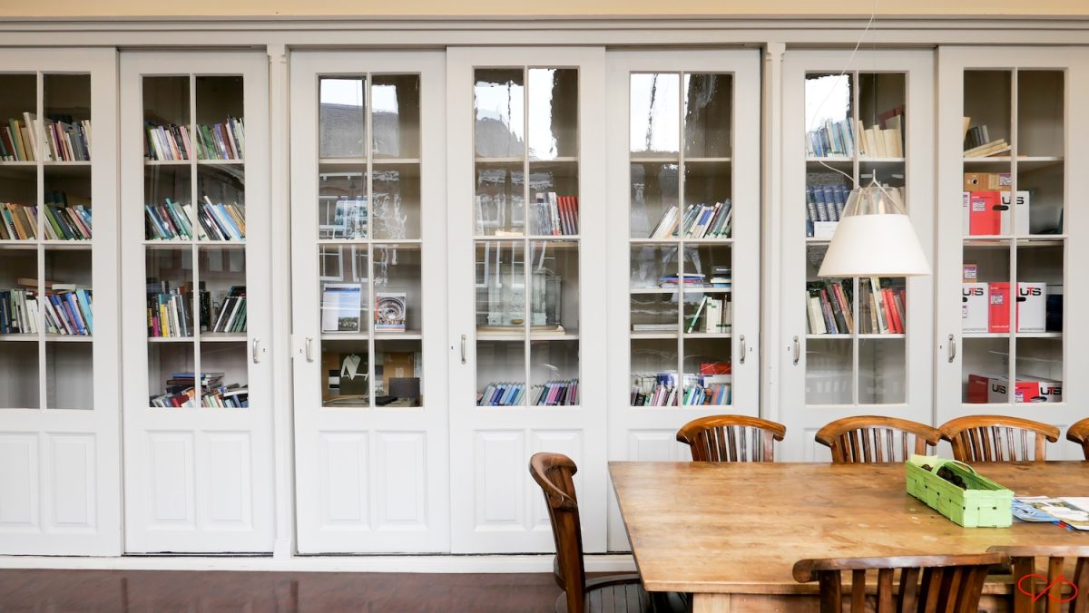 En tenslotte een enorme boekenkast met schuifdeuren.