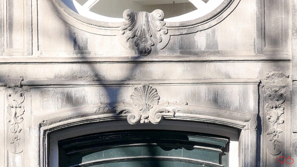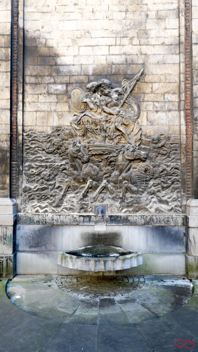 Net om de hoek naast de poort is dit enorme reliëf met fontein. Weliswaar is de topgevel verdwenen, het reliëf en de fontein zijn er nog. De fontein stelt het moment voor dat Amphitrite door Poseidon geschaakt werd, ze werd weggevoerd in een door zeepaarden getrokken strijdwagen. In de golven zien we wat tritons die op kinkhoorns blazen.