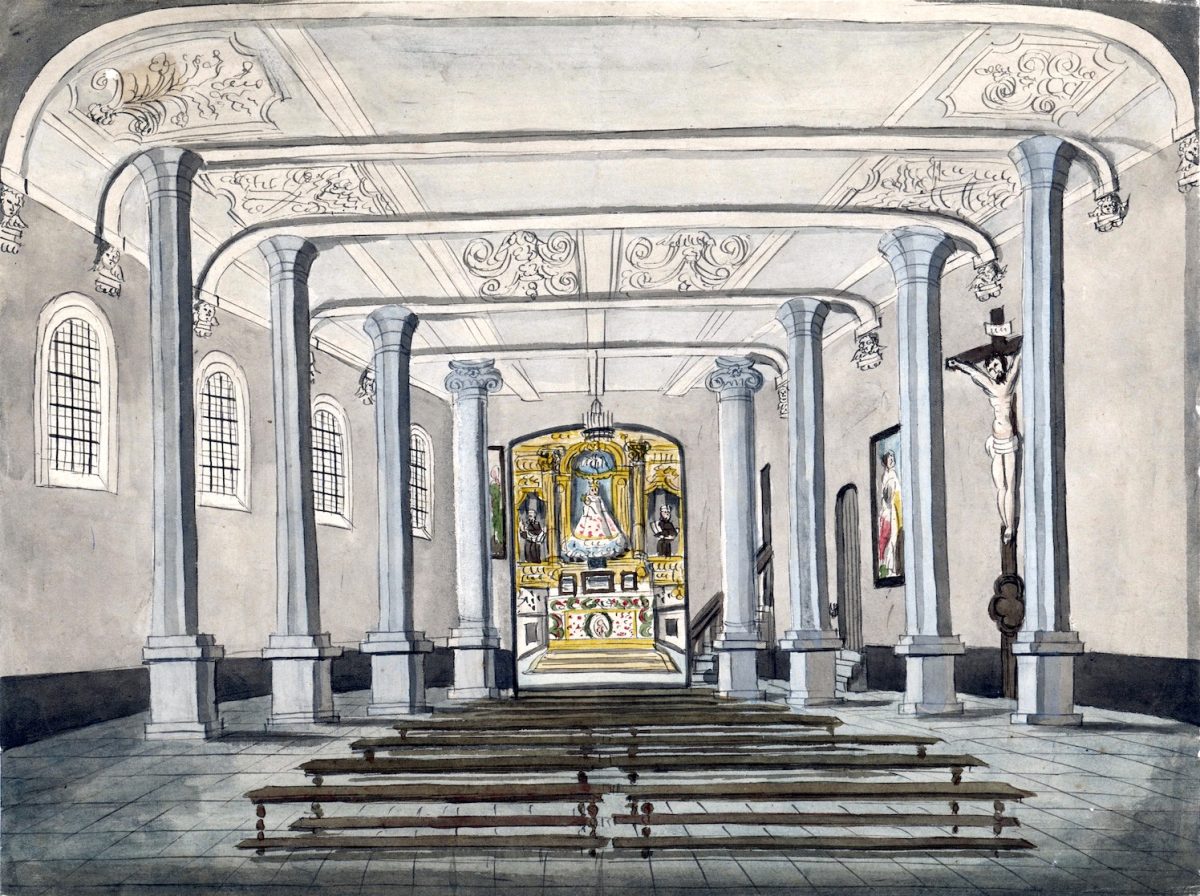 Nog een keer deze crucifix van Jan van Steffeswert, gemaakt rond 1510. De corpus met kruis heeft eeuwenlang gehangen in de kapel van de Nieuwenhof. Op de tekening van Philippe van Gulpen zien we ‘m ook: rechts, achter de eerste pilaar. Het hing er tot 1983.