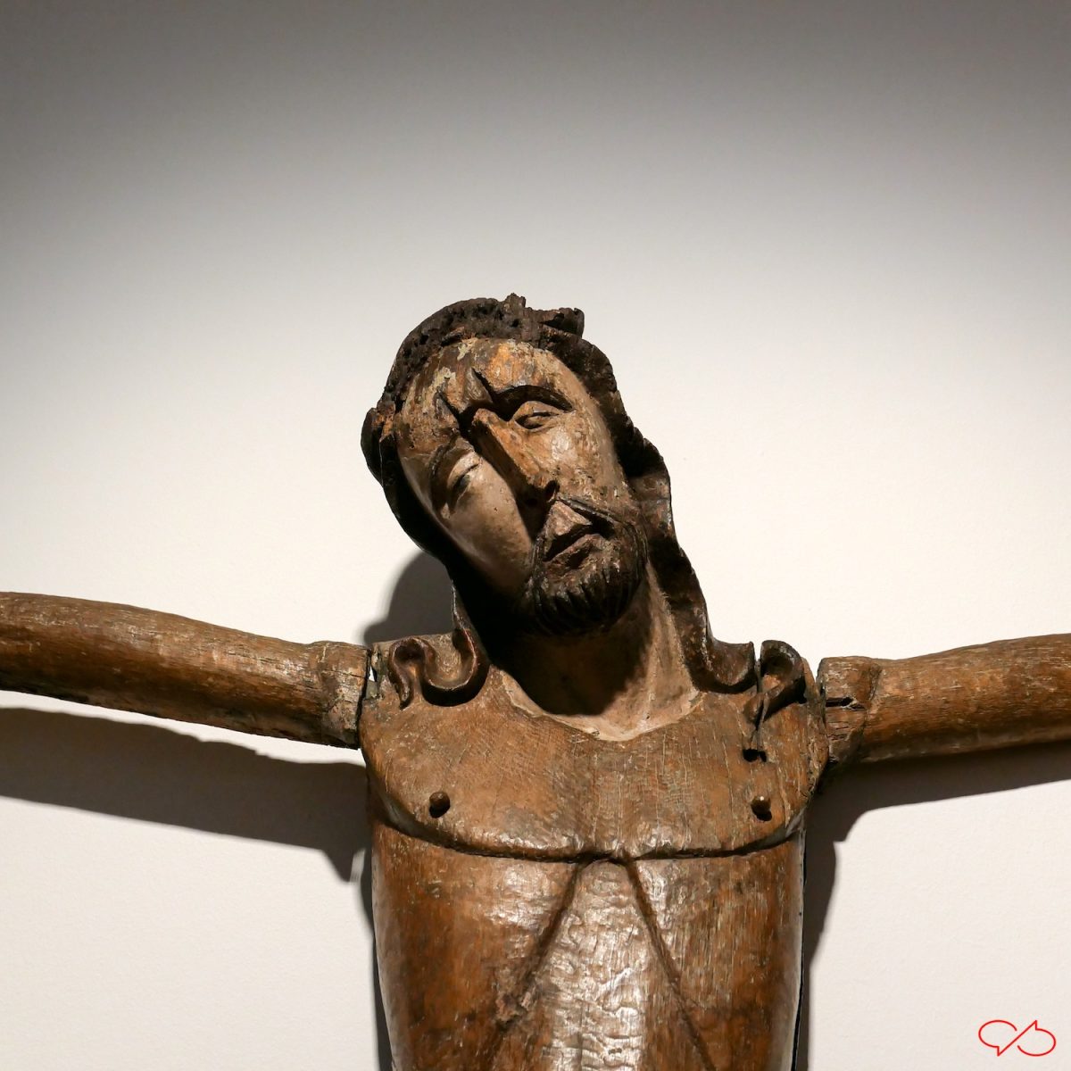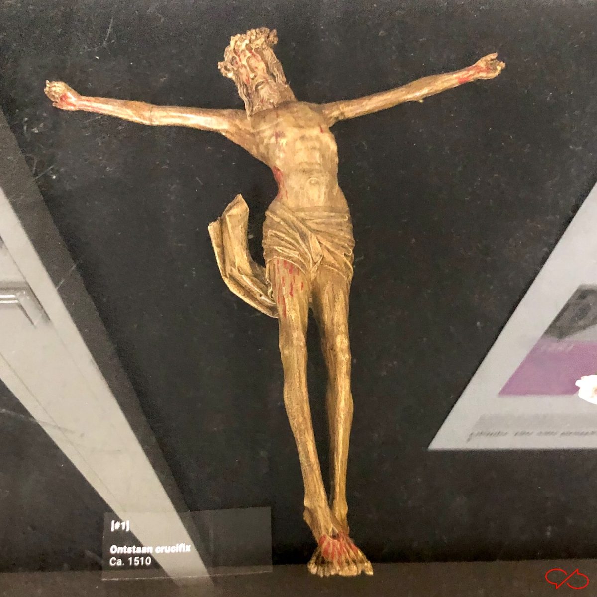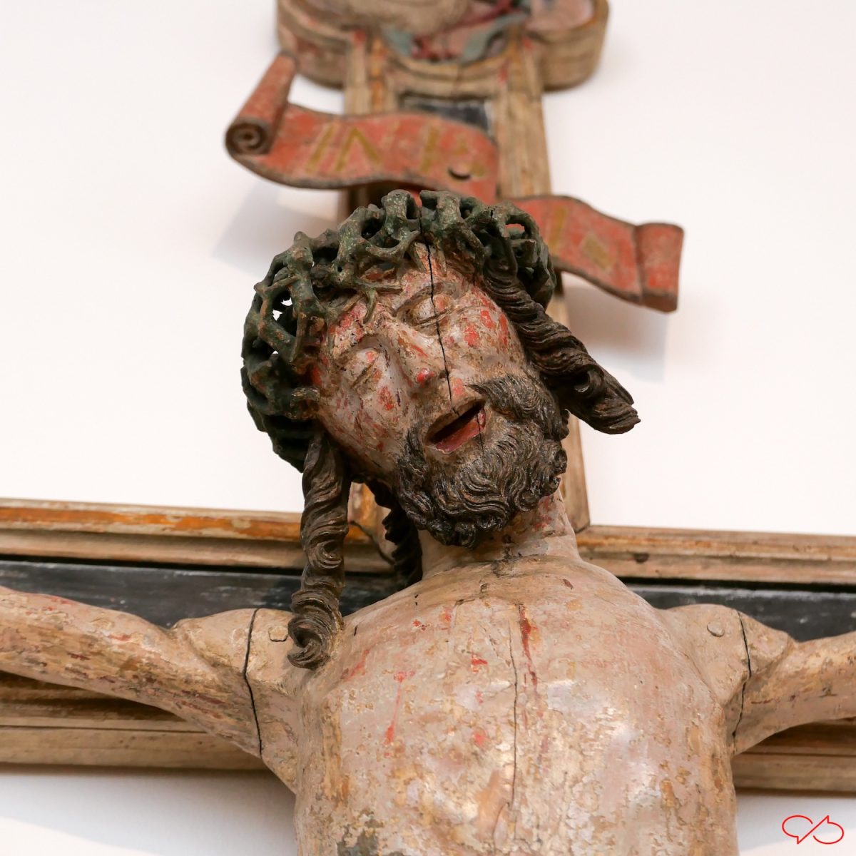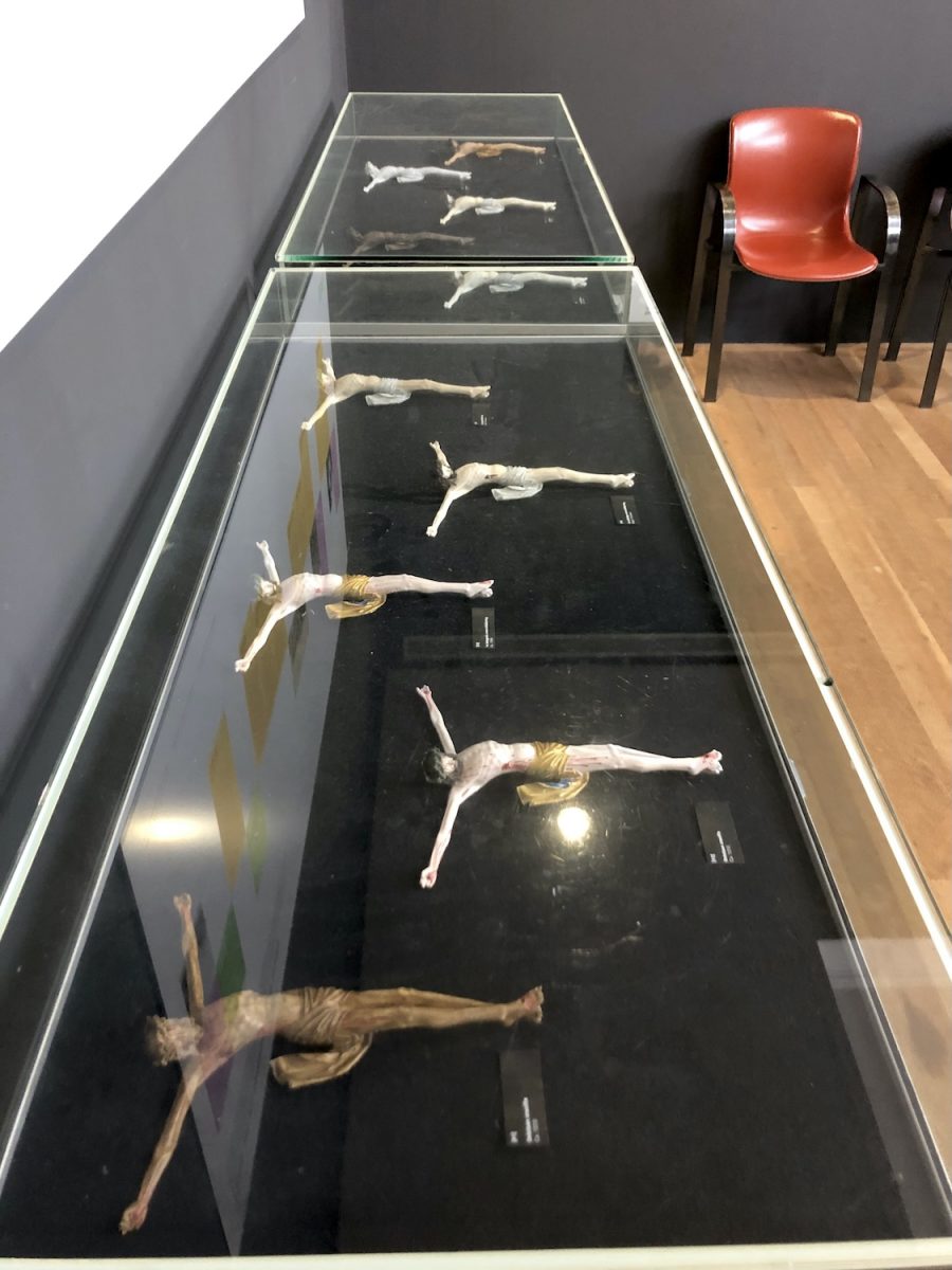 De eerste is een corpus, meer dan levensgroot, met doornenkroon, van Jan van Steffeswert, circa 1510. De grootste doornen zijn verdwenen, ze waren ooit in de gaten gestoken. Lange pieken die de dramatiek flink versterkten.