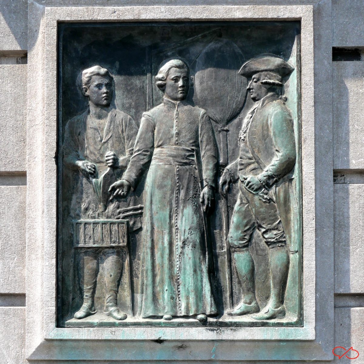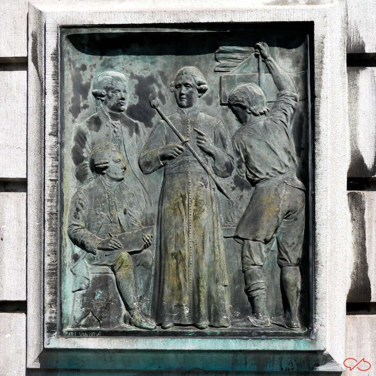Op twee zijpanelen zien we hem als docent. Hij legt het procédé uit, zijn leerlingen luisteren en maken aantekeningen. Hij was in Leuven aan de universiteit hoogleraar fysica. En hij deed natuurwetenschappelijk onderzoek. Al met al dorstig werk, zo achter die vlam, dat pèlske had hij wel verdiend.