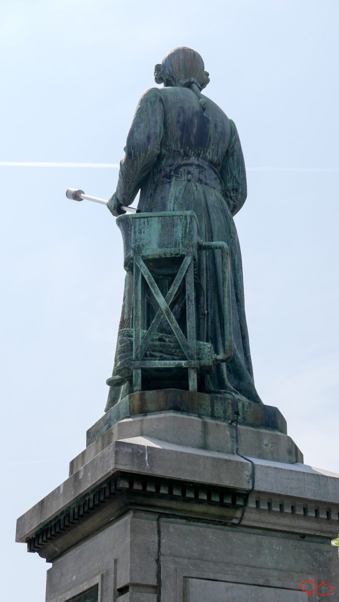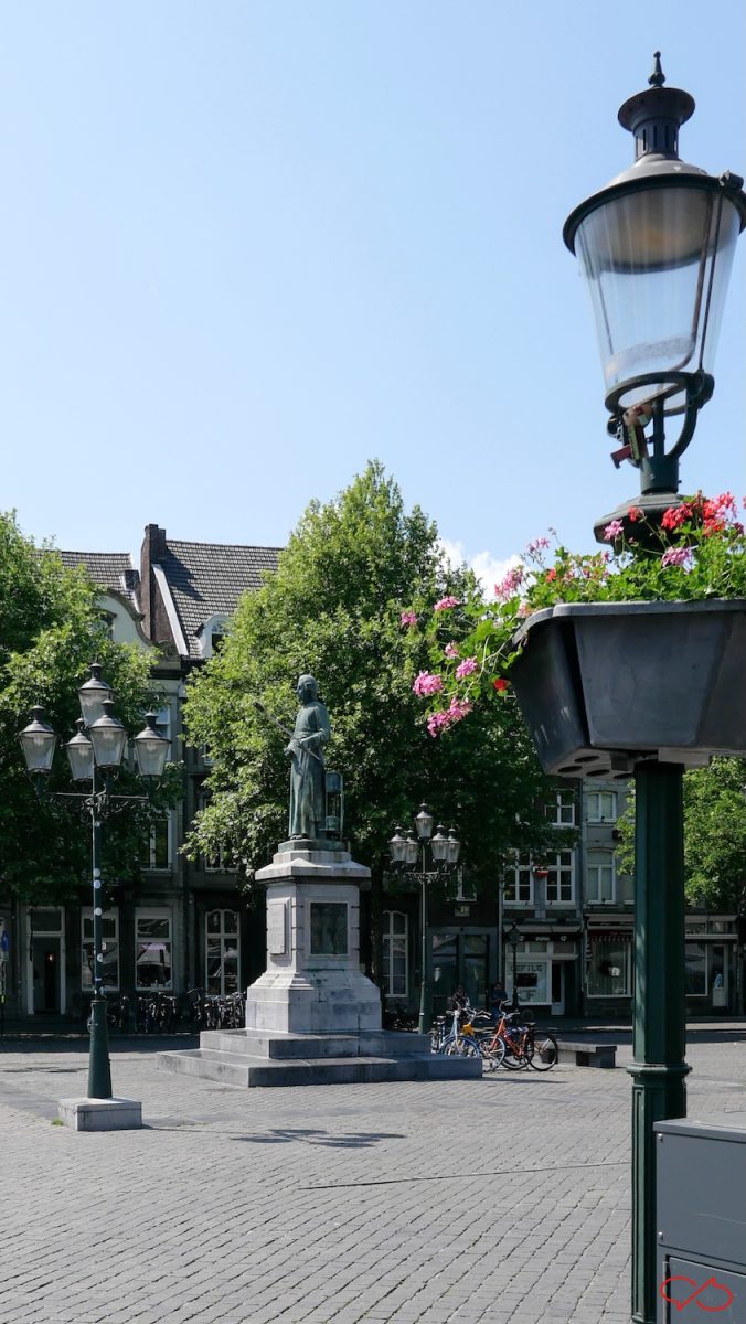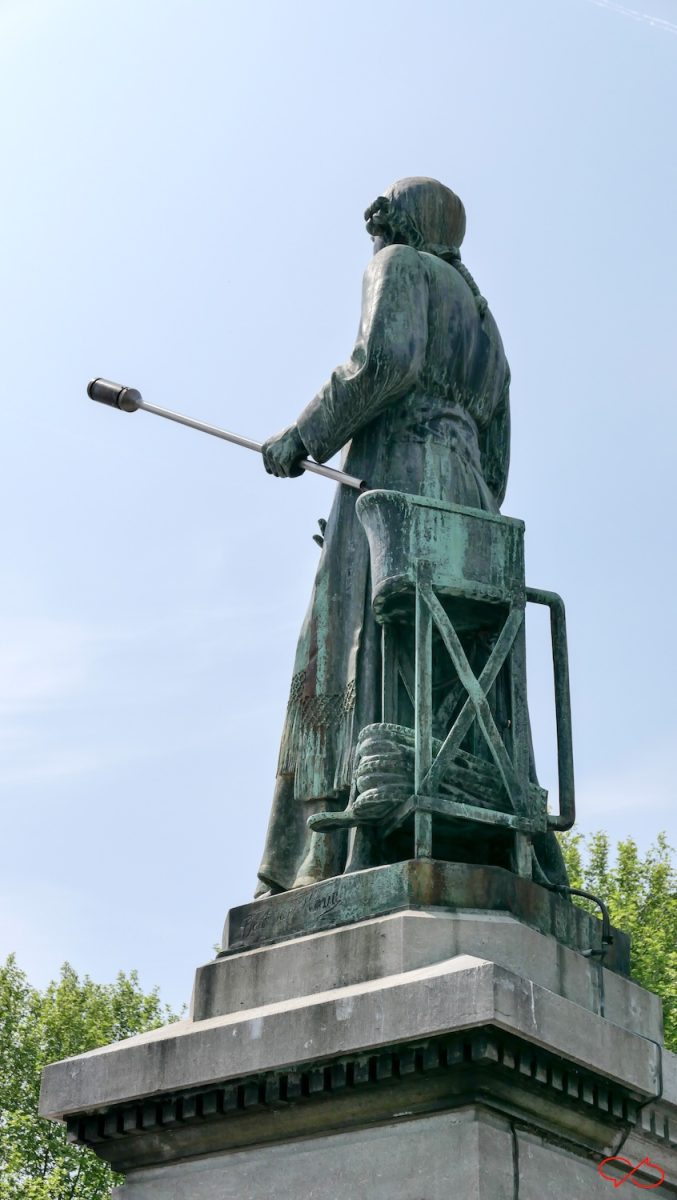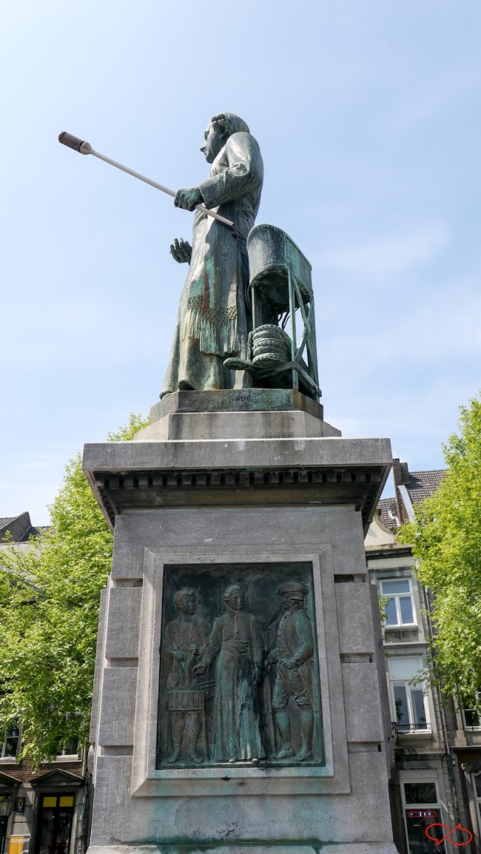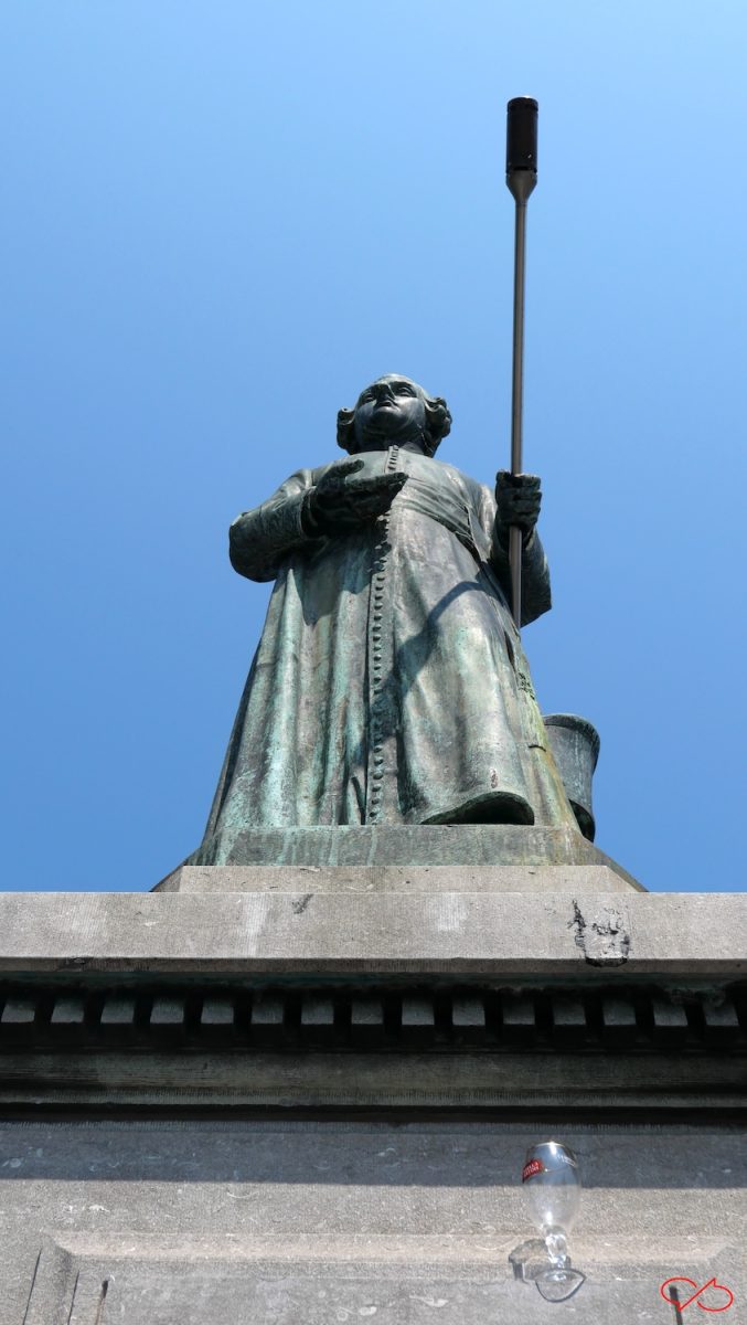 Het beeld stond aanvankelijk meer richting Markt. Daar werd het drukker en het beeld schoof naar achteren. En het laten branden van de vlam werd te duur. Of beter gezegd, de ambtenaar die steeds moest opdraven om de uitgewaaide vlam opnieuw aan te steken. En dus moest onze grote voorganger van het gas af. Wie hem die afschuwelijke toorts gegeven heeft, weet ik niet, maar het getuigt van weinig respect voor onze zo belangrijke stadgenoot en voor kunstenaar Van Hove. Geef hem alsjeblieft z’n oorspronkelijke toorts terug! En z’n vlam!