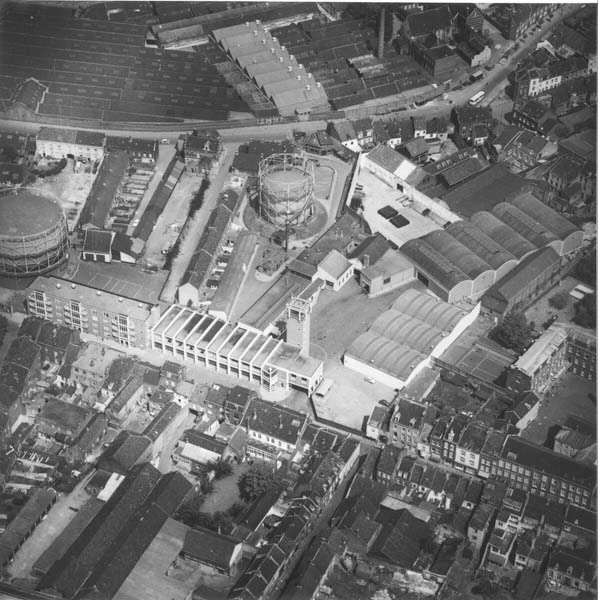 Hoe belangrijk Minckeleers’ uitvinding wel was, wordt duidelijk als je naar deze fabriek kijkt. Het vergassen van kolen om gas te winnen gebeurde in zulke cokesfabrieken. Daar werd van kolen gas gemaakt en cokes, een geweldige brandstof voor ovens en stoommachines, geweldig vervuilend ook. Bij de fabriek stond een gashouder, de container waar het gas werd opgeslagen. Een grote klok gaf de druk aan. Die druk was nodig om het gas door leidingen te transporteren naar woonhuizen. Dat gebeurde niet alleen in Maastricht, Minckeleers’ ontdekking werd wereldwijd toegepast. De voorlopers van déze fabriek stonden tussen 1858 en 1907 aan de Maagdendries, op de luchtfoto zien we de brandweerkazerne.