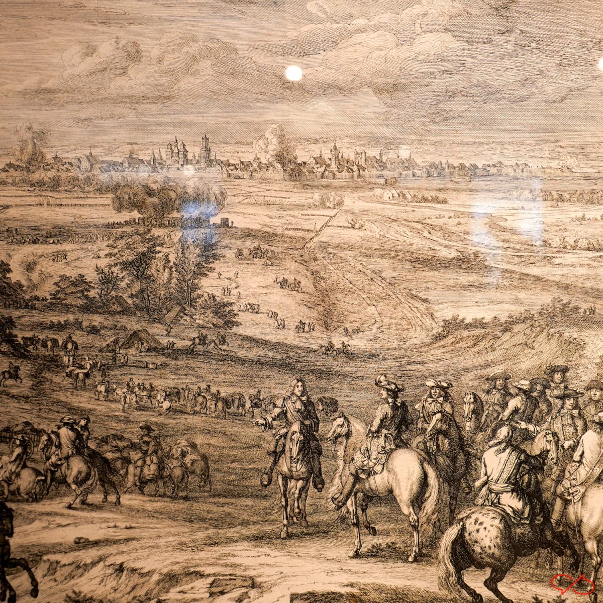 Is dat nou niet wat veel, zoveel aandacht voor de Zonnekoning? Hier in Maastricht natuurlijk niet. Het is op de kop af 350 jaar geleden dat hij de stad belegerde en na dertien dagen innam. En dat moet herdacht worden. Mijn advies is: ga kijken. Dan zie je bijvoorbeeld deze ets. Daarop staat op de voorgrond de meneer XIV met zijn gevolg. Maar je kunt ook de loopgraven goed zien. En de plaatsen waar de kanonnen de stad bestookten en waar de kogels neerkwamen. En dan kruipt de geschiedenis toch onder je huid.