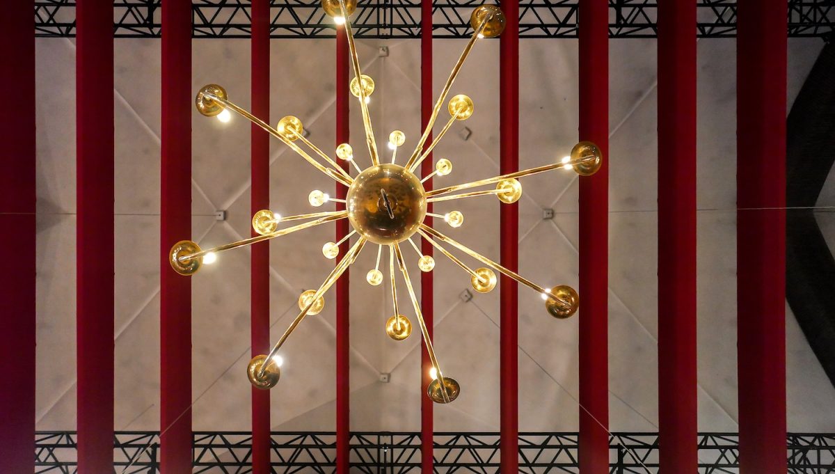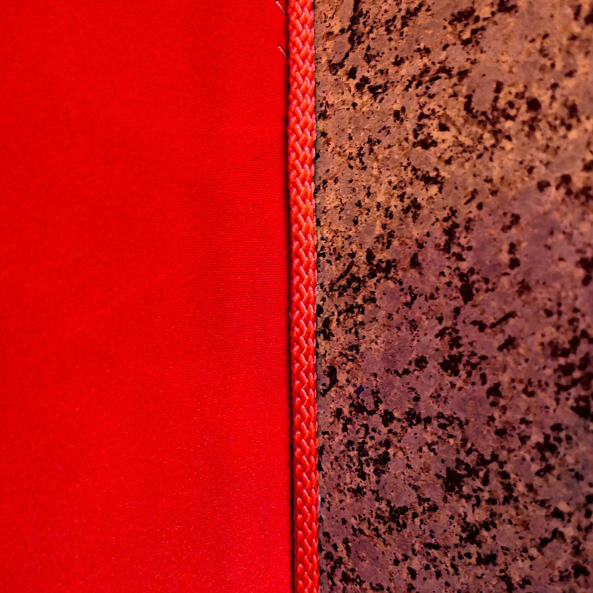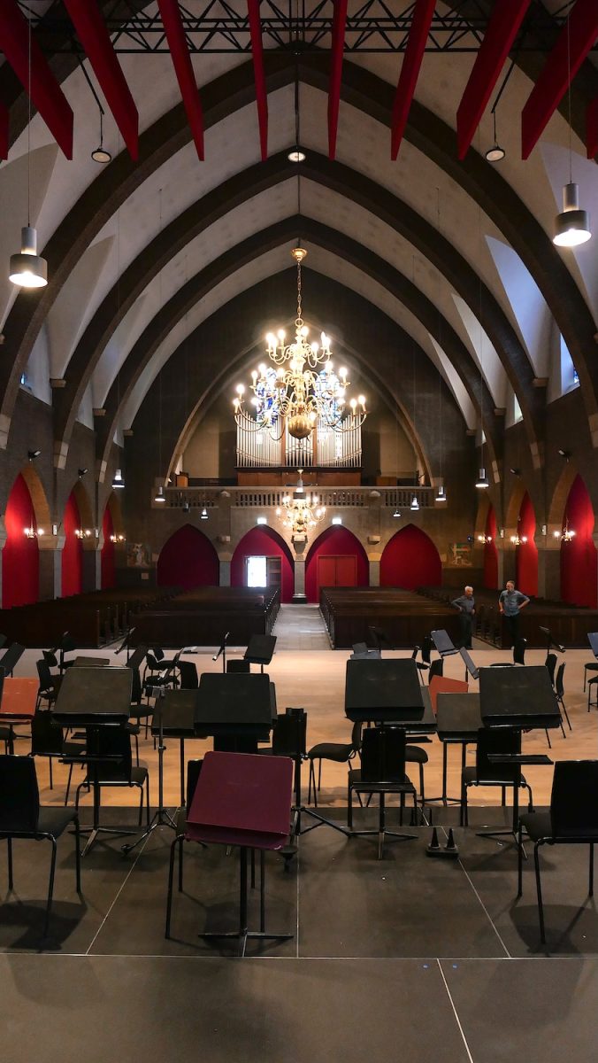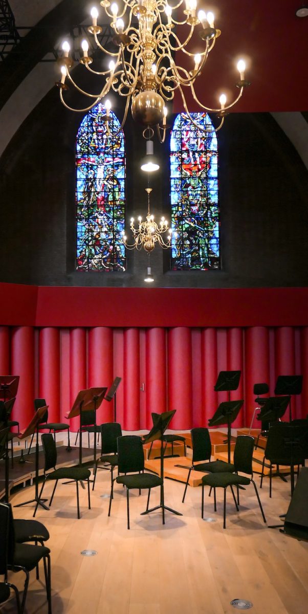 Maar het is ook in gebruik als oefenruimte met kantoren en opslag. Daarvoor waren flink wat aanpassingen nodig, vooral voor de akoestiek. Met verhoogde vloer en allerlei rode schotten langs muren en plafonds. Erg netjes gedaan met oog voor detail. Kijk maar eens naar dat rode biesje tussen schot en stenen pilaar. En zie hoe herkenbaar de kerk zelf nog is. Deze nieuwe situatie heet Opus 9 en die huist in de Theresiakerk.