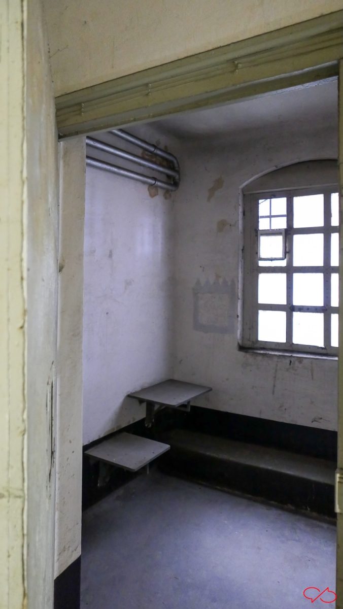 Een dikke houten deur met slot en twee schoten. In het midden een luikje met kijkglaasje. Binnen een raampartij met matglas, een raampje kan open voor wat frisse lucht. Aan de muur een klaptafeltje en -stoeltje. Aan de andere muur een opklapbare brits. Op de latten kwam een matras. En in een hoek de doos. Onder het ronde deksel zit een pot. Die kan via een luik in de gang vervangen worden door een lege, dan hoeft men de cel niet in. In de opening bovenin de muur zit een lampje dat de cel en ook de gang verlicht. De dikke buizen zijn voor de verwarming.