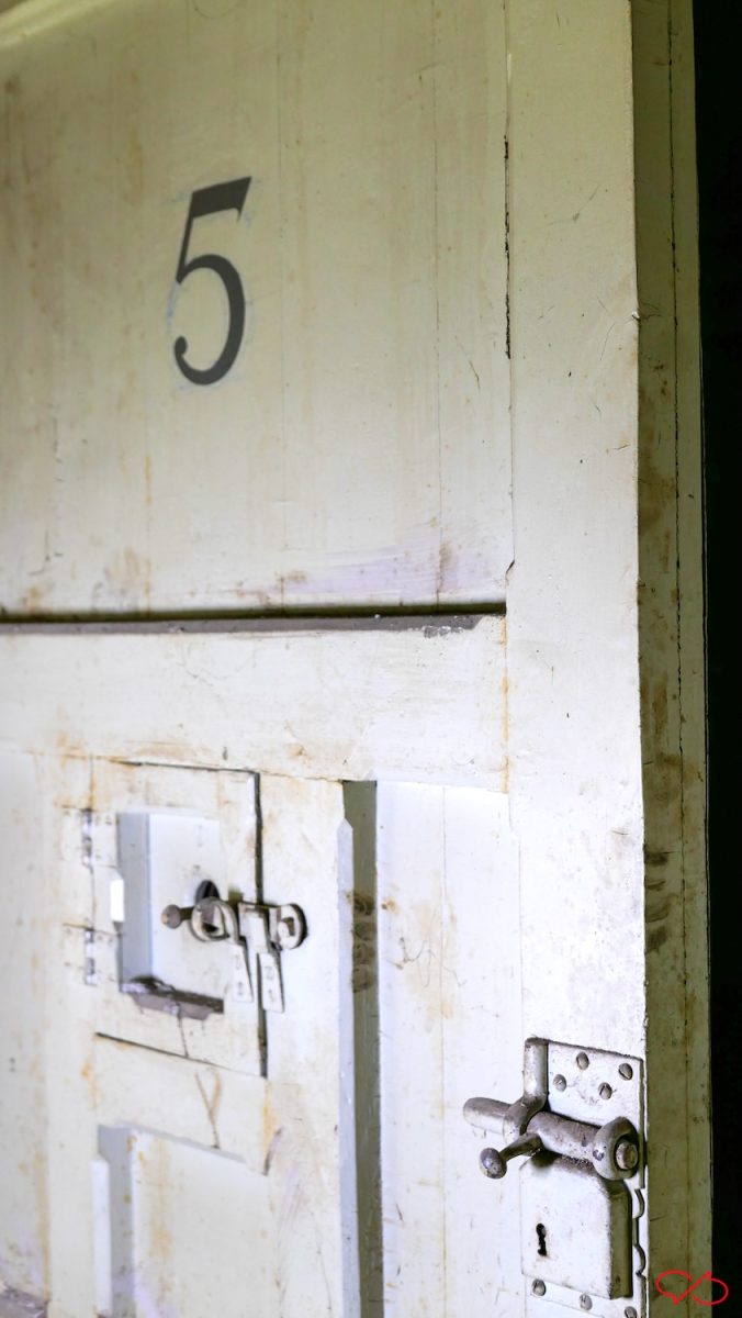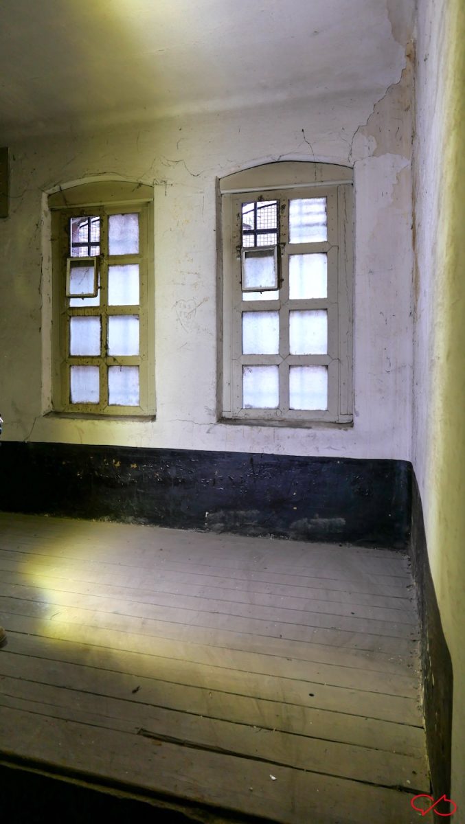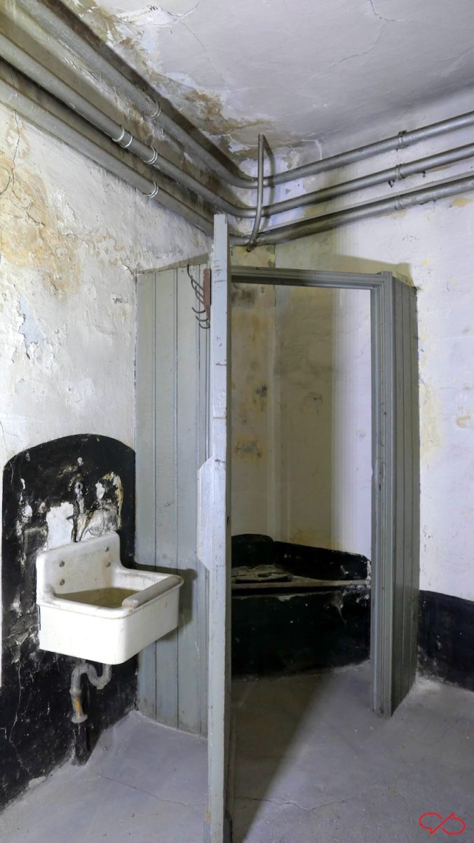 We zijn nog niet uitgekeken in het cellenblok. Er zijn twee eenpersoons cellen, nummers 3 en 4. Maar nummer 5 is voor meerdere personen. In de hoek is een afgeschoten privaat. En een wasbakje. Het grootste deel van de cel wordt in beslag genomen door een verhoogde houten vloer. Een plaats voor matrassen? Het is heel goed mogelijk.