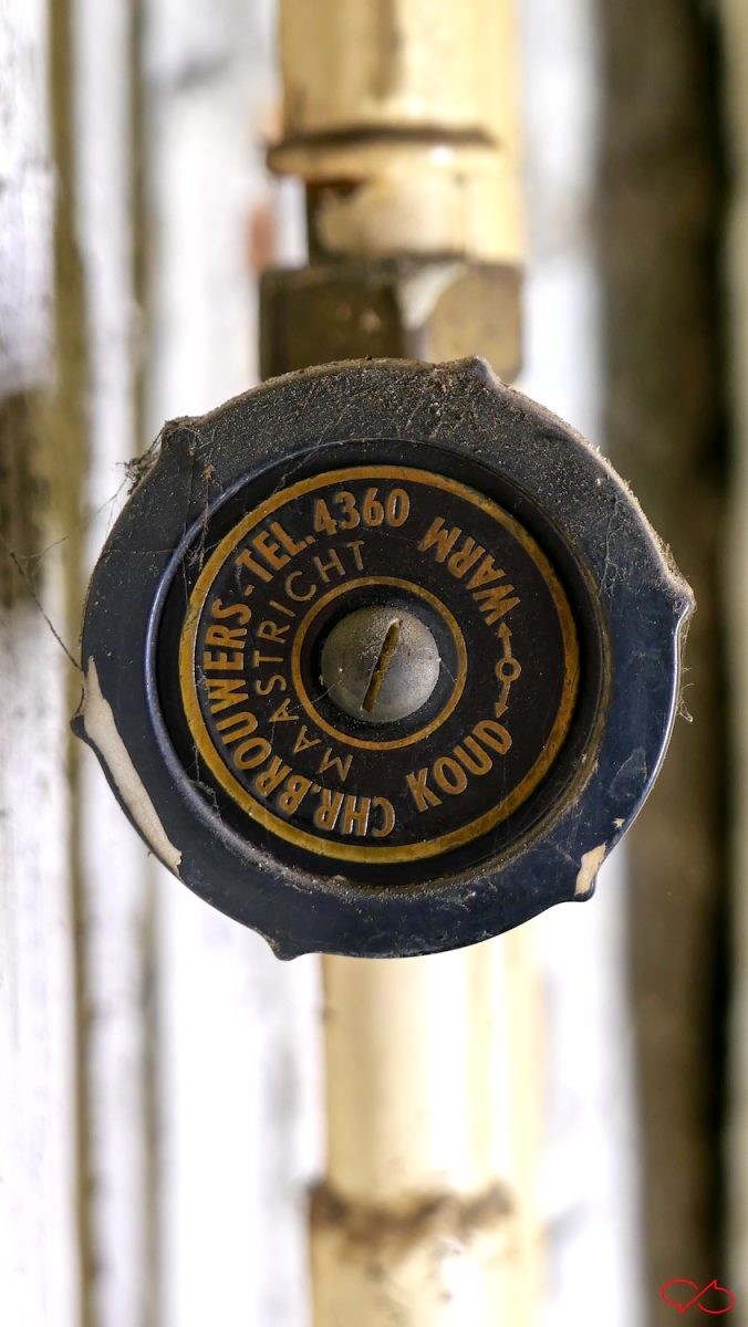 Op de deuren staan nummers. Een letterschilder heeft in blauw krijt aangegeven hoe het cijfer moest worden geschilderd. Dat gebeurde vroeger uit de hand. En zie de cv, de dikke buizen. Die is aangelegd door installateur Chr. Brouwers uit Maastricht. Zijn telefoonnummer was 4360. Het is toch hartverwarmend dat de service zover gaat dat je kunt zien welke kant je op moet draaien.