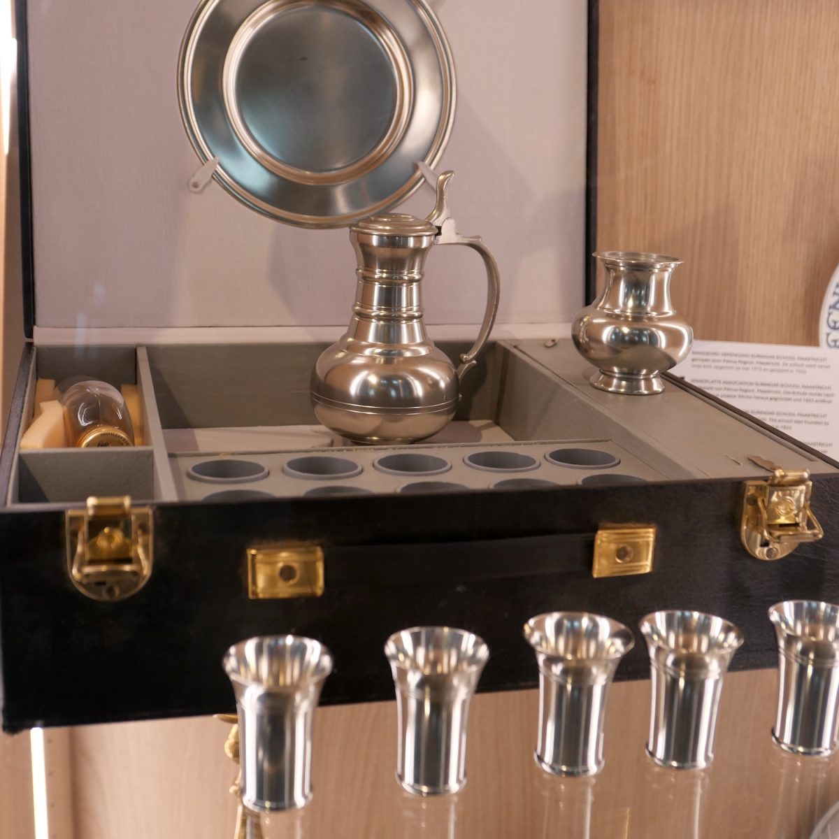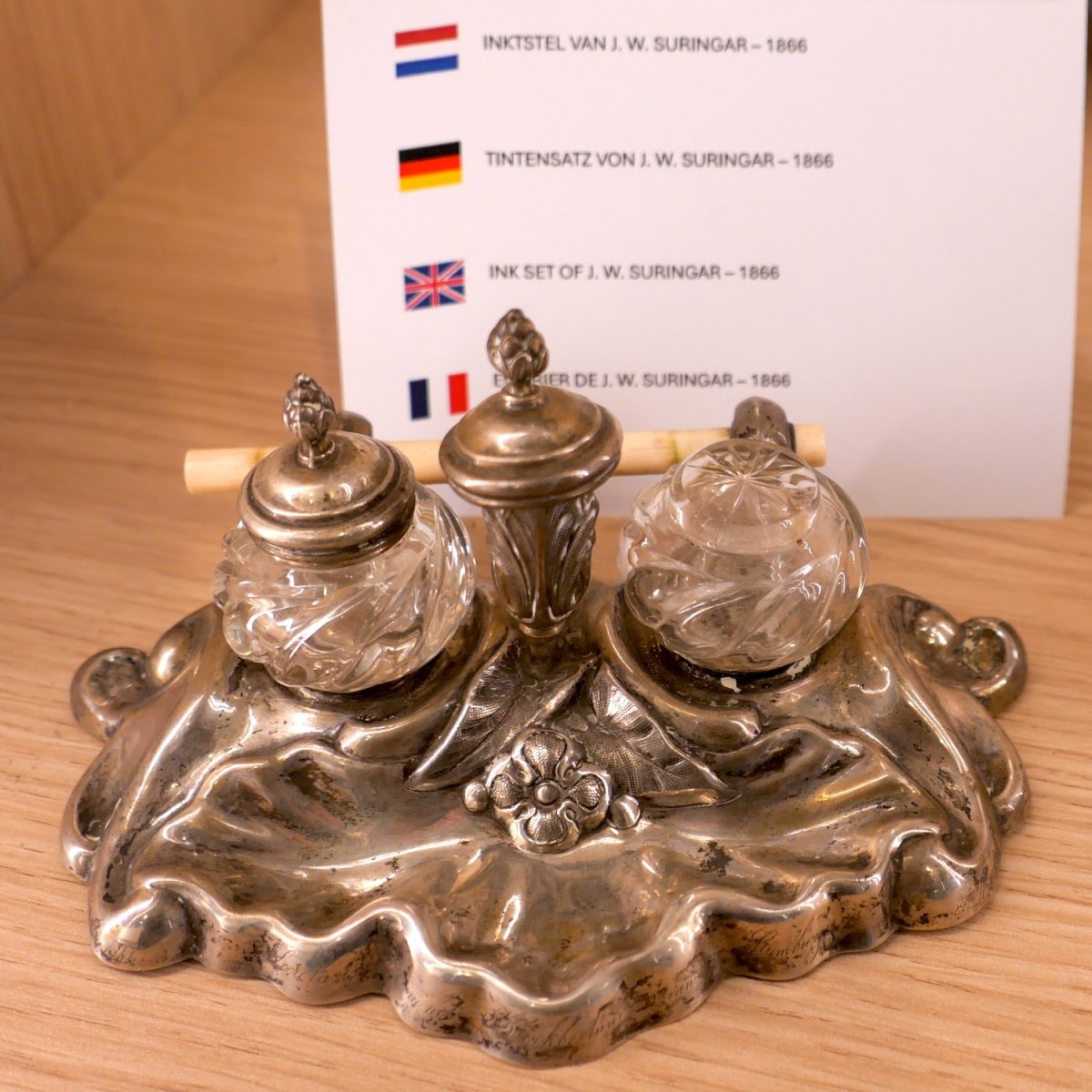 Nu heeft men in de kerk twee vitrines ingericht. Met dezelfde spullen. Zodat iedereen ze kan zien. Een transportabel laatste avondmaalstel om zieken te kunnen bedienen, verschillende bijbels waaronder een ferme Statenbijbel en een uit 1732. Het lettertype is fraai, maar in onze ogen moeilijk leesbaar. En het inktstel van JW Suringar uit 1866. Joachim Willem was hoogleraar theologie en predikant, hij overleed in 1892 in Maastricht. De Suringarschool is naar hem genoemd.