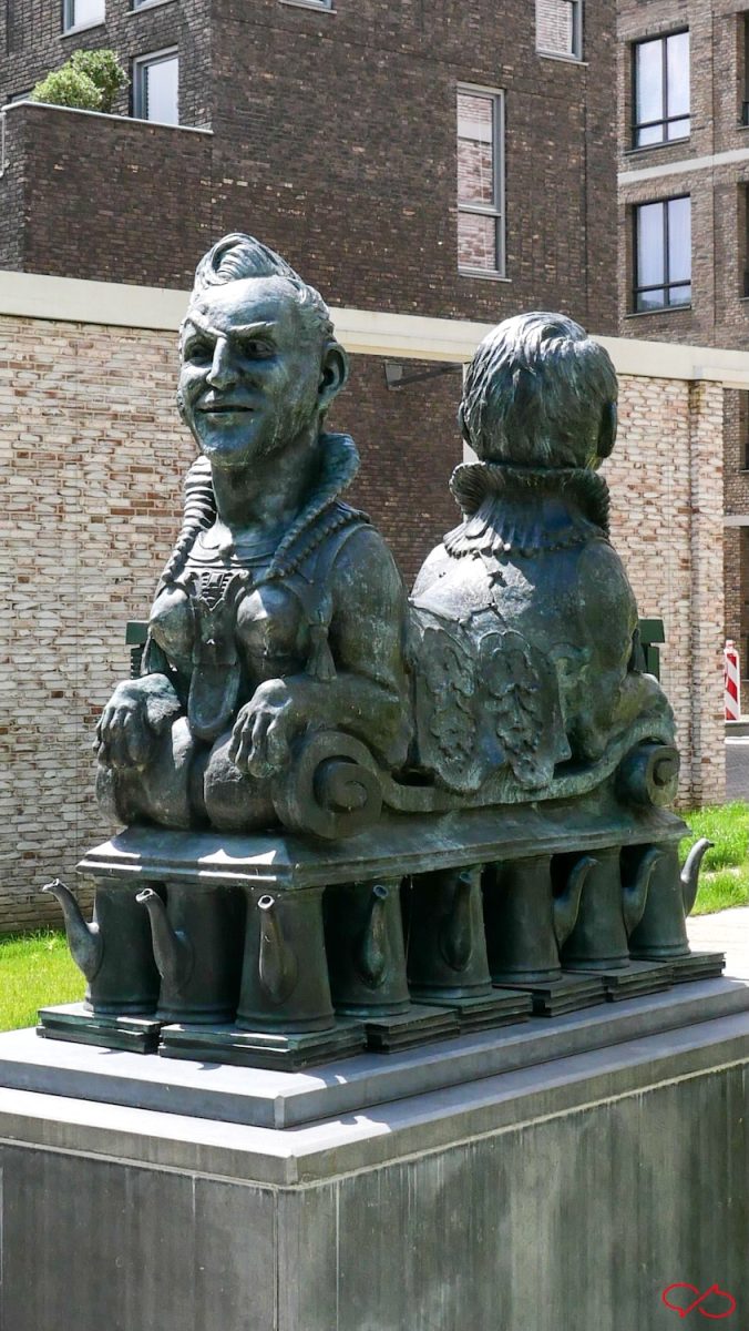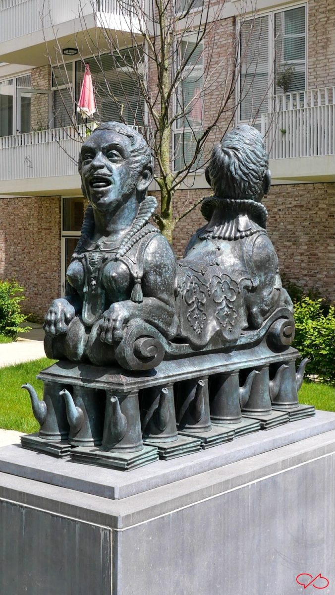 De beelden zijn vaak samenstellingen uit andere beelden of voorwerpen. Het bonzen beeld heet “Le Dialogue” en staat op een binnenterrein aan de Andriespoort in het Statenkwartier. De plaats die zoveel te maken had met de keramische industrie. Vandaar dat er stapeltjes tegels zien op de bodem met daarop koffiekannen. En daarop een bijna Siamese tweeling van rijk aangeklede sfinxen die natuurlijk alles te maken hebben met de Sphinx. De koppen zijn de hoofden van de makers.